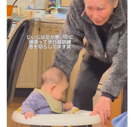 この日はベビー歩行器を押して遊んであげていた曾祖父さん。身をかがめて押すのは少し疲れてしまったようですが、それでも息子さんのために押してあげたかったのでしょうね。