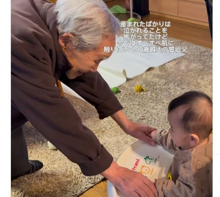 曾祖父さんは、息子さんが可愛くて仕方ない様子。足が悪い曾祖父さんは、普段は座って抱っこしたり離れて見守ったりしているそうです。