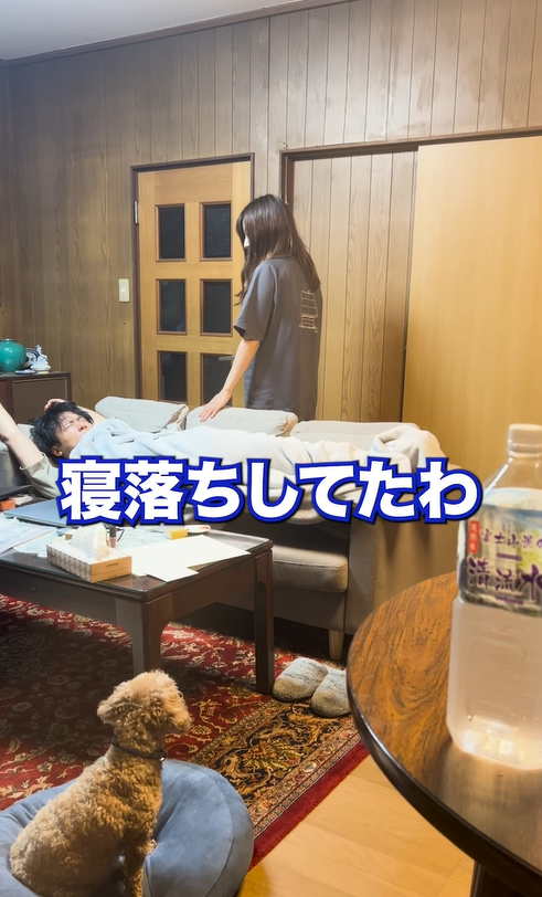 ソファで寝落ちしてしまったゆうたさん。りょうこさんはSNSでもらったコメントに返信をしていました。