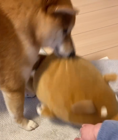 動画では生後7ヶ月の息子さんと、ワンちゃんの久兵衛くん(2歳)がぬいぐるみを取り合う光景が映し出されています。
