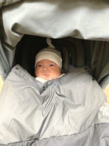 生後1ヶ月半だった頃の息子さんは、初めてのベビーカーに緊張している様子。3月の初めだったため、まだ寒く防寒対策をしっかりして出かけたといいます。