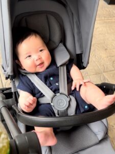そして、生後7ヶ月になった現在は、すっかり慣れた様子。ベビーカーに乗って、笑ったり寝たりお茶を飲んだりと、自由に過ごしているようです。しかし、たまに険しい顔つきが残っているときもあるとのこと。