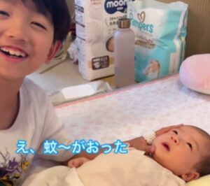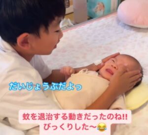 ママさんがびっくりすると「蚊がおった」と言うお兄ちゃん。実はお兄ちゃんは、蚊から妹さんを守っていたのです。