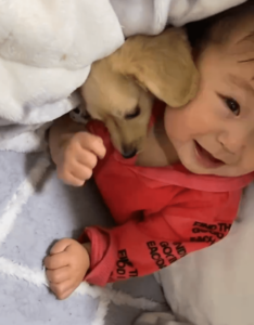 布団の中で子どもとじゃれている子犬の姿。そのようなシーンを見ると、つい微笑んでしまう方も多いのではないでしょうか。そんな投稿が今、TikTokで話題になっています。今回はこのような微笑ましいシーンについて、投稿者である@m620866さんに話を聞きました。