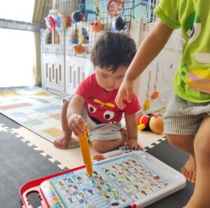 普段の次男くんは、ブロック遊びやバスの玩具で遊ぶのが好きだといいます。お兄ちゃんの後についていったり、本を読んだりすることもあるのだとか。