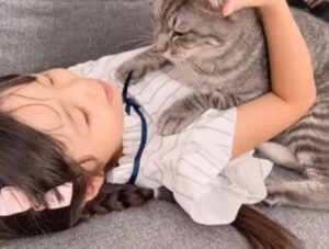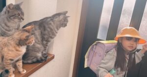 猫ちゃんたちは、昔から娘さんのごっこ遊びの相手をしており、現在も同じように過ごしています。また、娘さんが幼稚園に通っている頃から朝のお見送りをしていた猫ちゃんたちは、小学生になった今でも変わらずに見送っています。