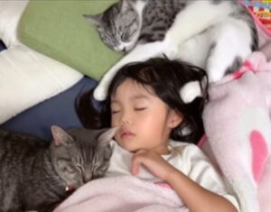猫ちゃんたちは、1歳くらいまでは3匹で遊ぶことが多かったそう。歳を重ねるごとにママさんたちへの愛情表現をすることが多くなり、娘さんのお昼寝に合わせて寄り添うことも増えました。