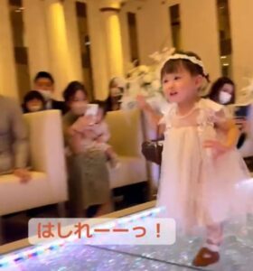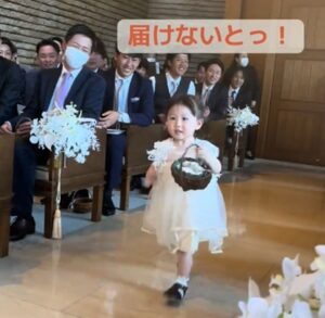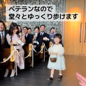 3回目は叔母の結婚式。4歳になったりみちゃんは、経験を積んだことから、おちゃらける余裕があるほど堂々としています。バージンロードを走ることなく、堂々とゆっくりと歩いて届けます。