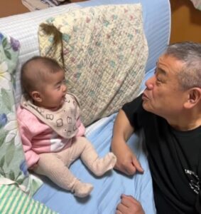 そんな娘さんに、じいじは手をあげて「はーい」と応じます。ニコニコと見つめてくれるじいじに、娘さんも声を出して喜んでいるように見えます。