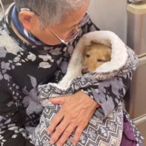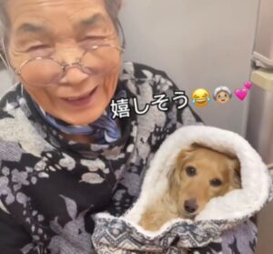 おくるみに包まれているのは、ダックスフンドのあむくん。おばあちゃんは、まるで人間の赤ちゃんのようにあむくんを抱っこしています。