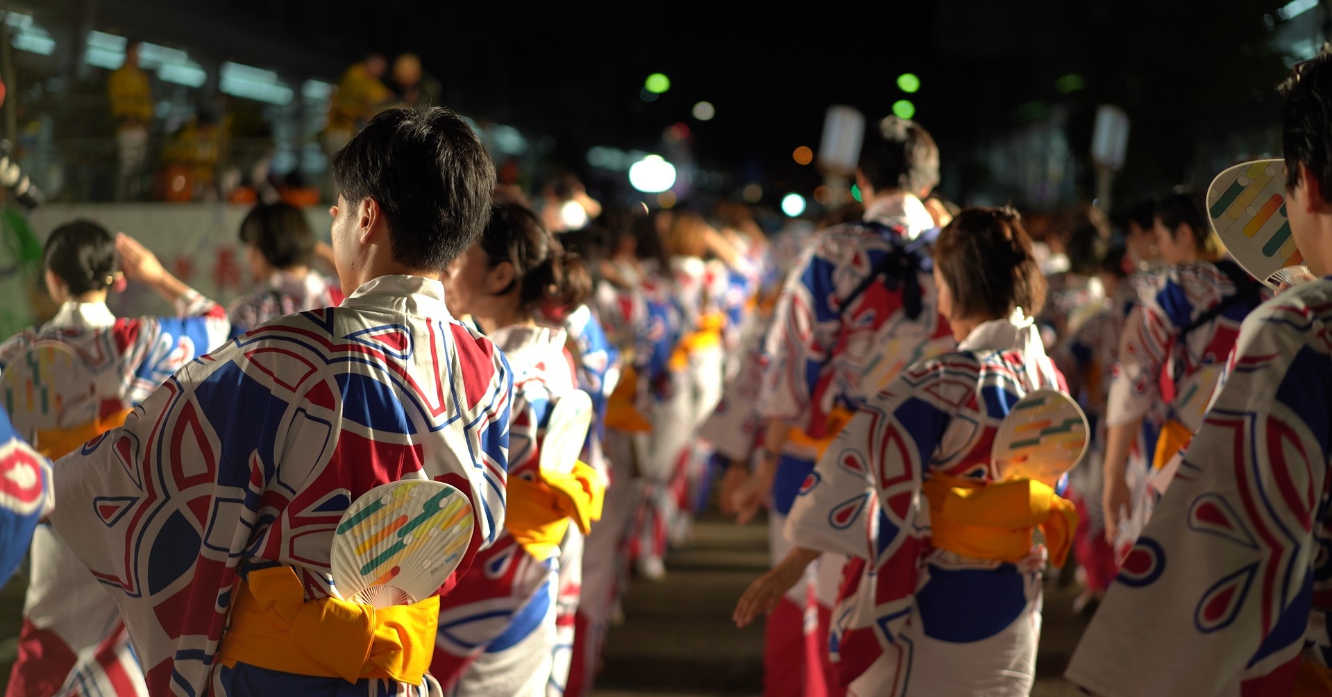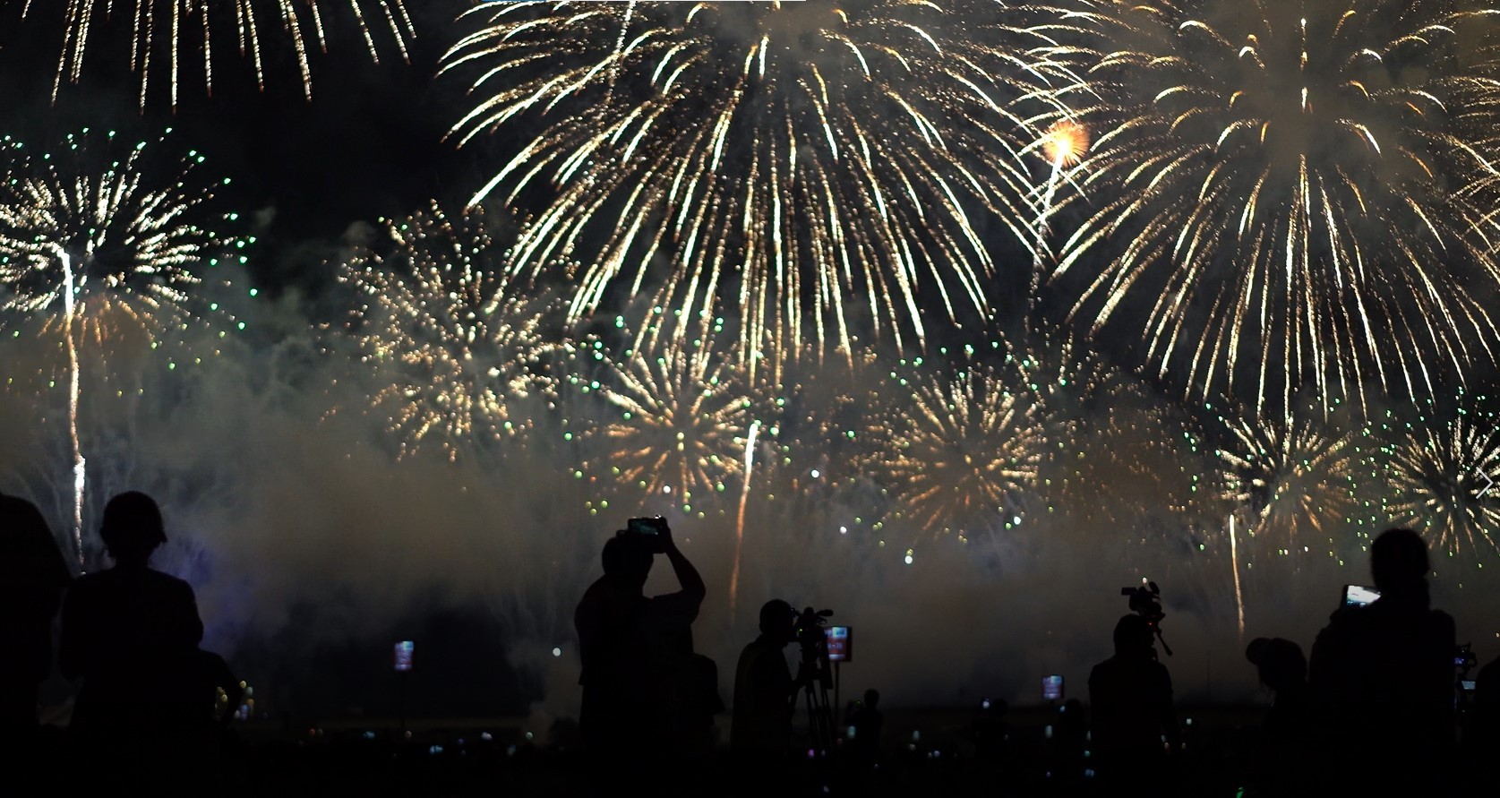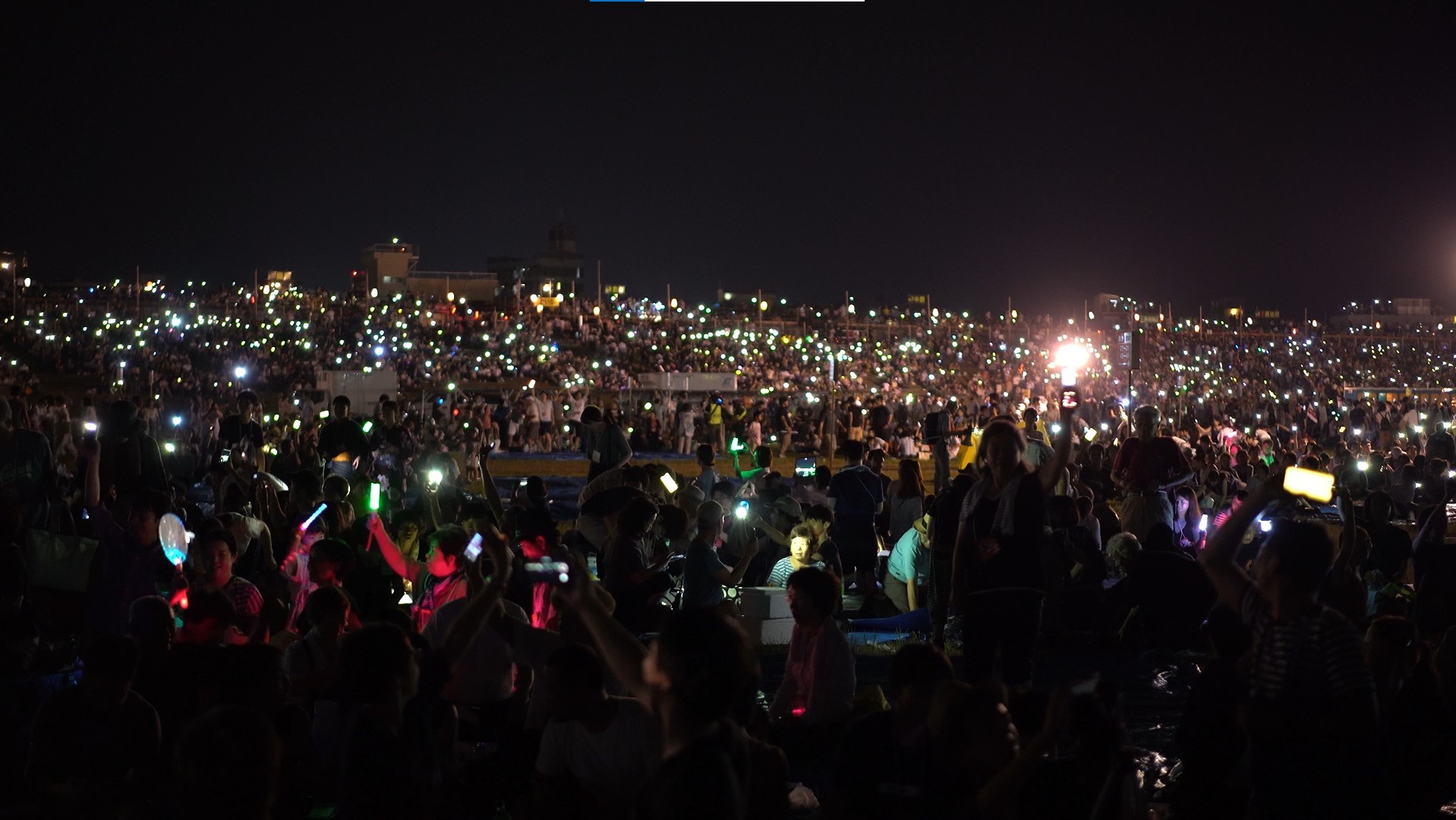 長岡花火の1シーン。ライトアップしたスマホを、観客は一斉に振ります。