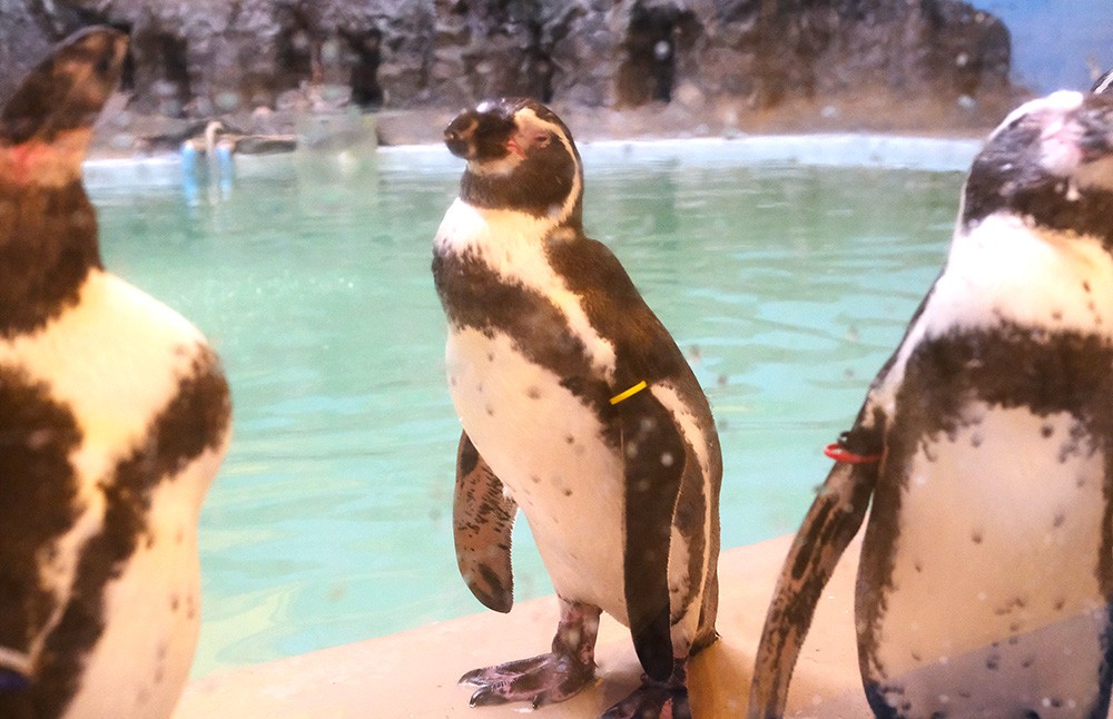 個性豊かなペンギンたち。腕に装着した輪っかで見分けられるので、新屋島水族館を訪れた際は、ぜひ20羽いる“ペンギンの関係”にも注目してみてください。