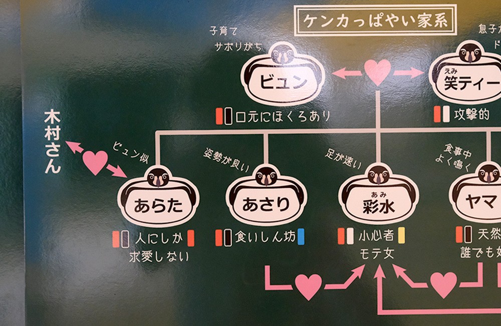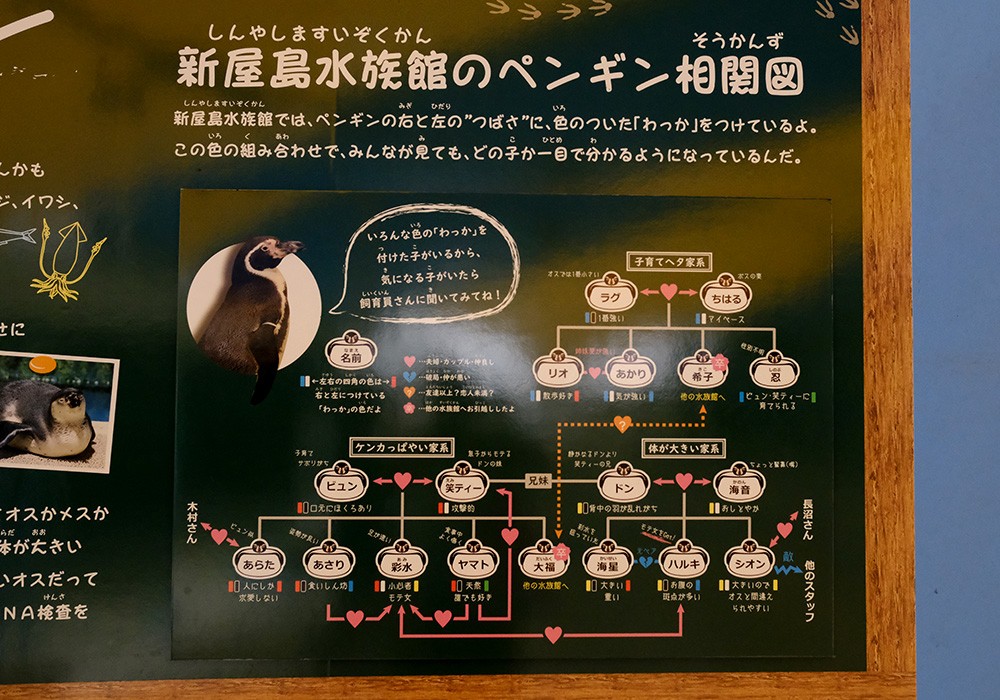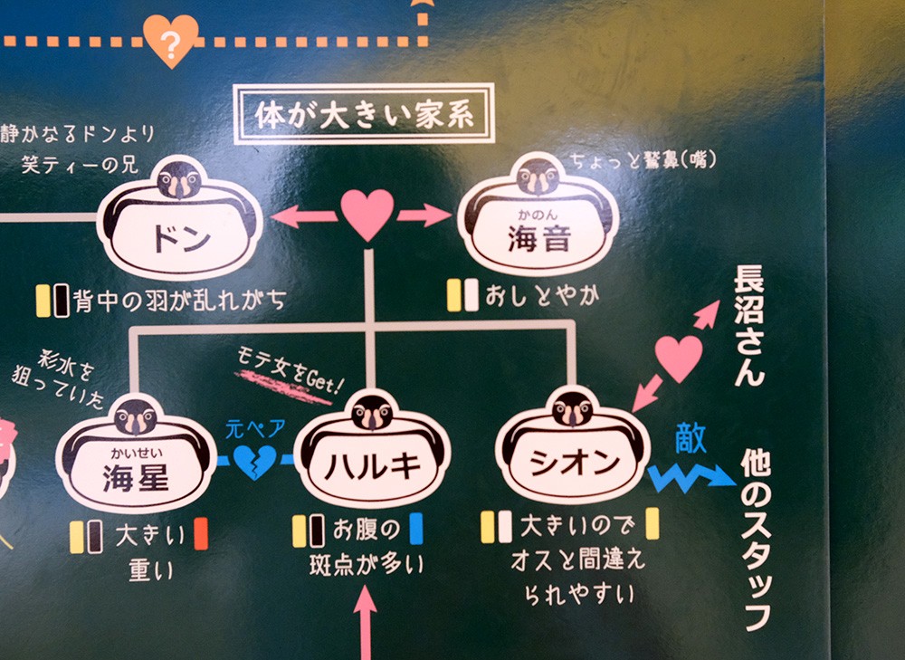 水槽の隣には、フンボルトペンギンの生態説明や、家族相関図が載った看板が設置されています。ペンギンの見分け方や兄弟関係に加え、求愛もハートマークと矢印とで描かれていますが、よく見ると「長沼さん」「木村さん」への矢印を持つペンギンたちがいるようです。