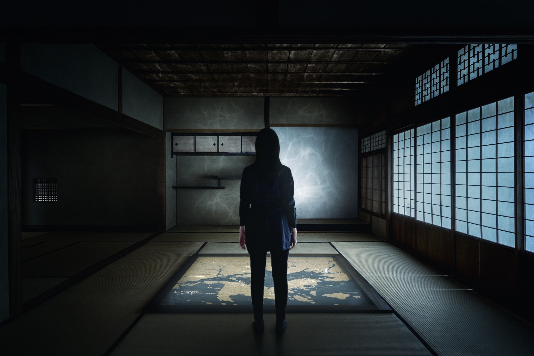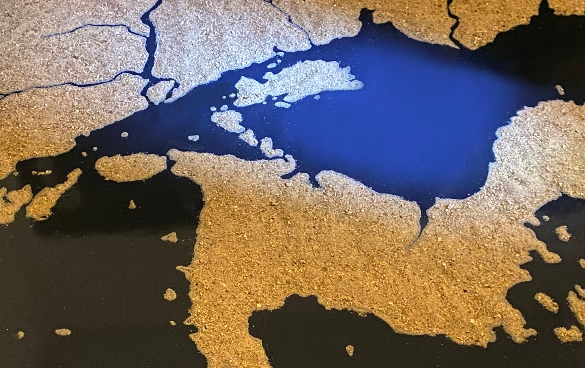 「穴海」は海水や海の砂を使って、畳の上に昔の海面水位をもとにした海を出現させるという大胆な構想。照明によって天井に海のゆらぎを映し出し、展示空間そのものを作品として体感できます。