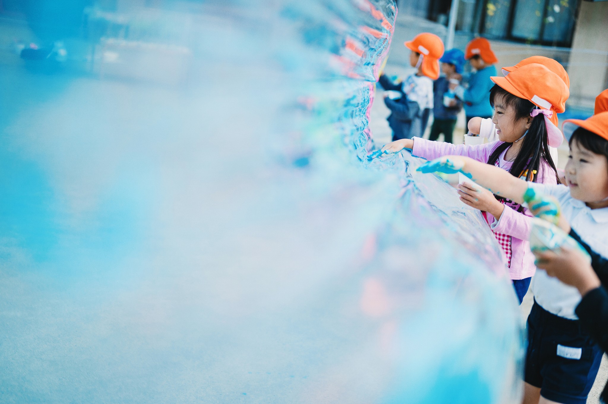 日頃芸術士として活動している香川県在住のミズカさんと幼稚園年長児による作品「いろいろうみいろ〜じぶんたちの海のせかい」は、海を表現したワークショップ作品です。園児たちが手や足を自由に使って、事前にビニールや不織布にポスターカラーでそれぞれの海を描きました。