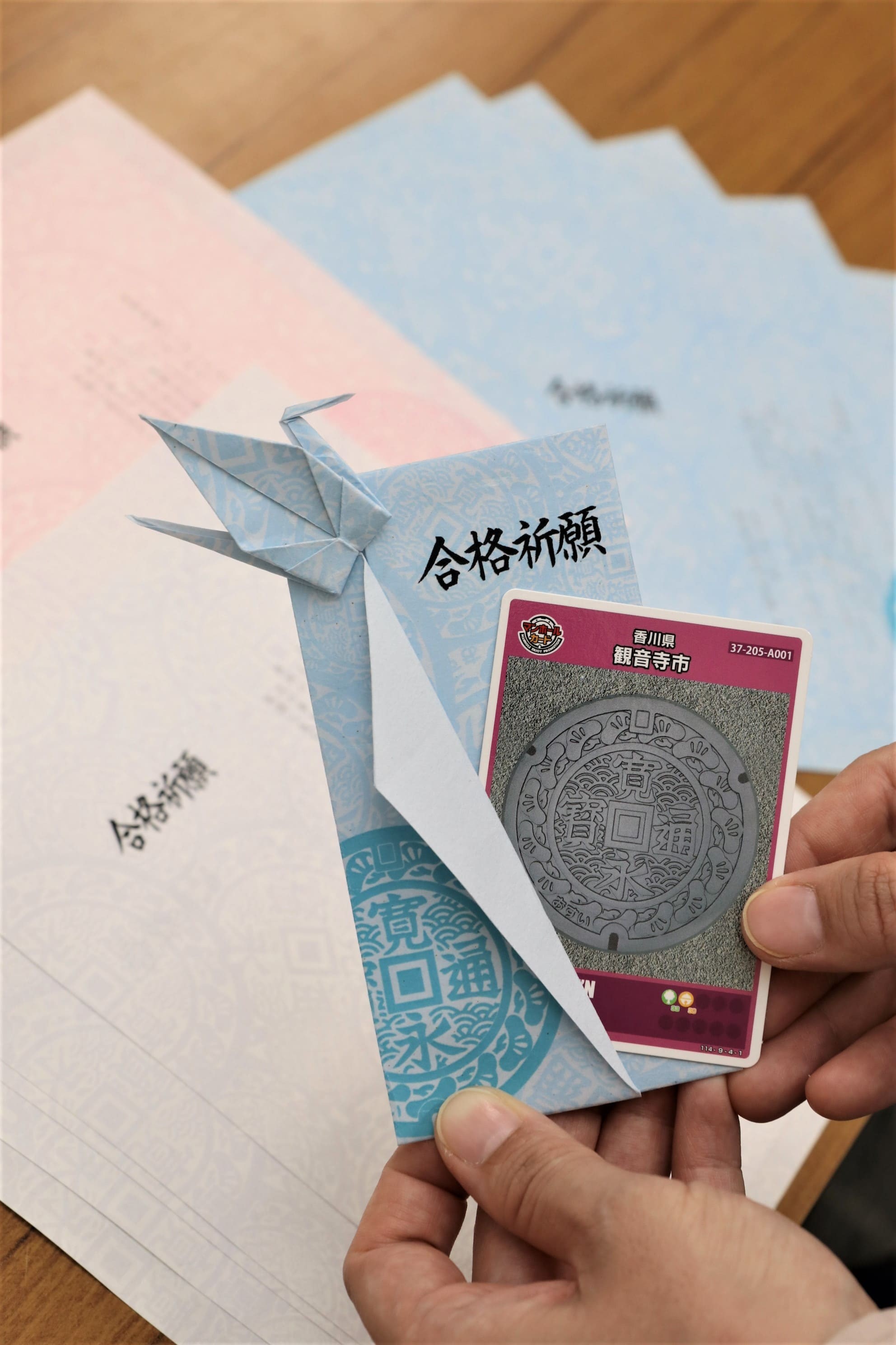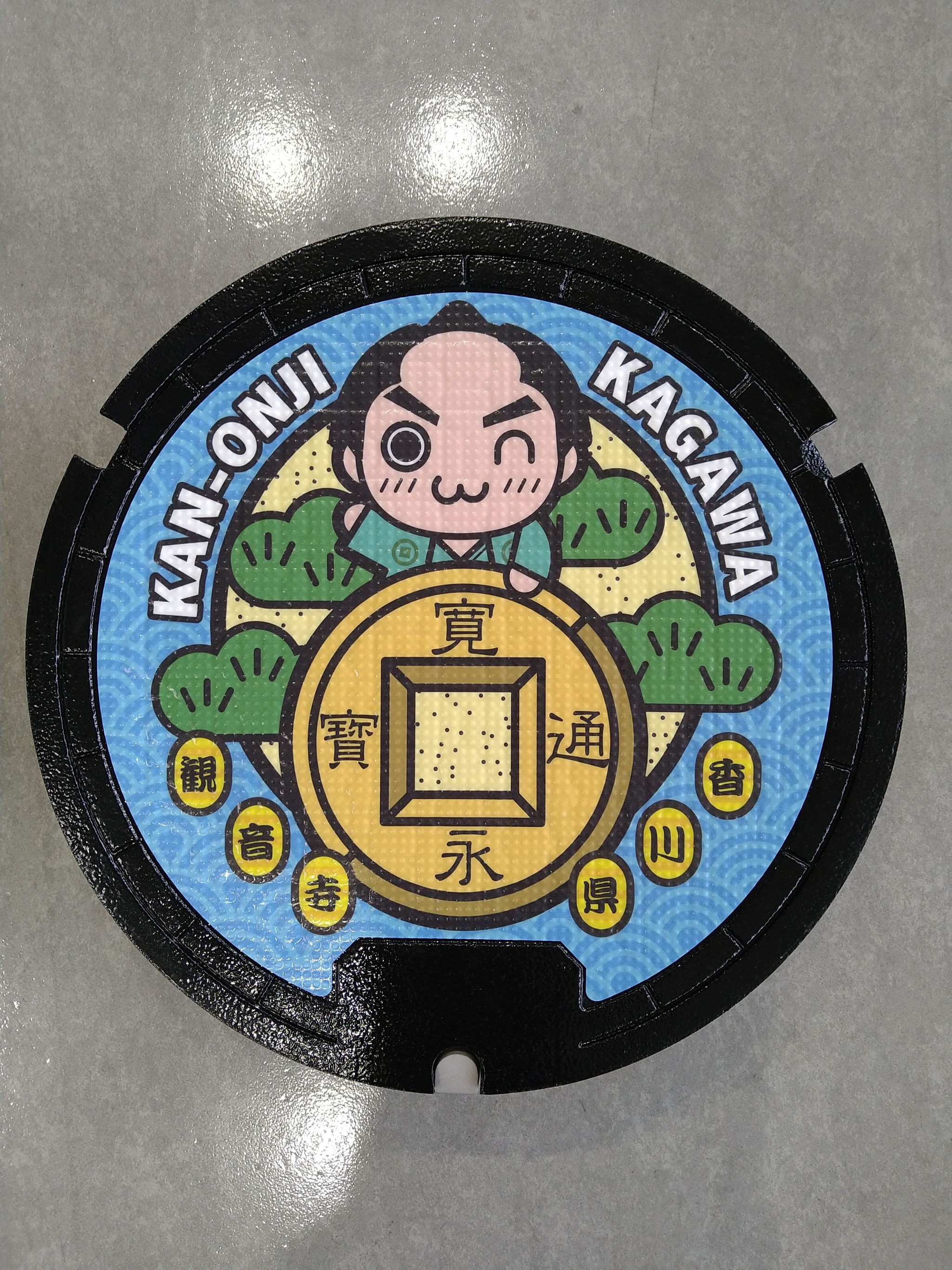 お守りに入っているカードに描かれているマンホール。市内に砂絵で寛永通宝が描かれているスポットがある(提供画像)