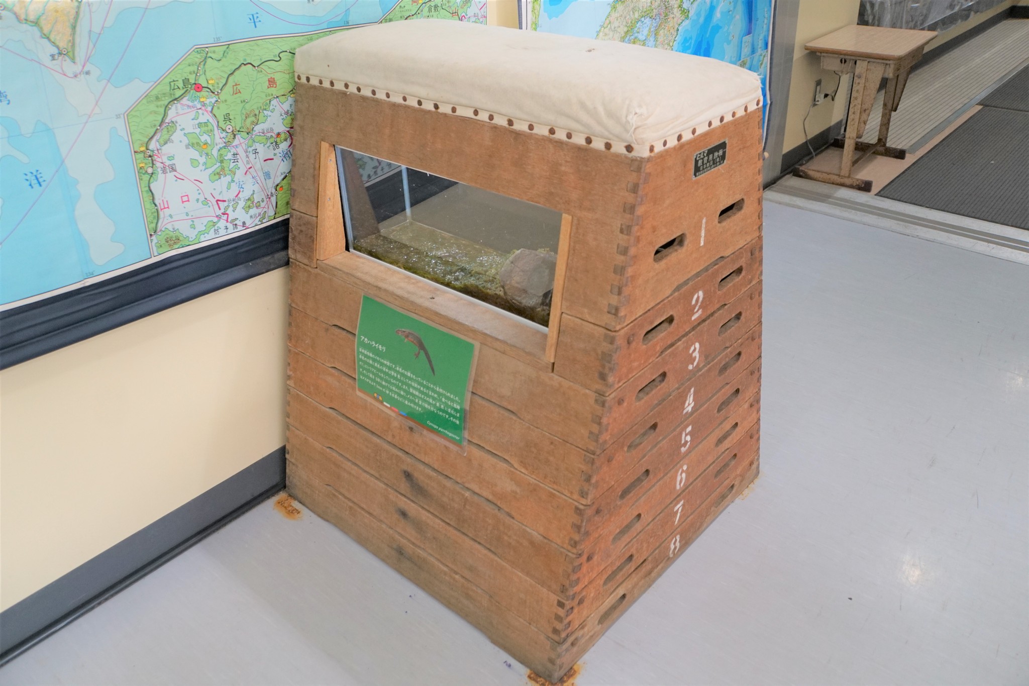2階へ上り、手洗い場(タッチプール)の中にいるヒトデと触れ合ったあとは、跳び箱の中にイモリを発見。