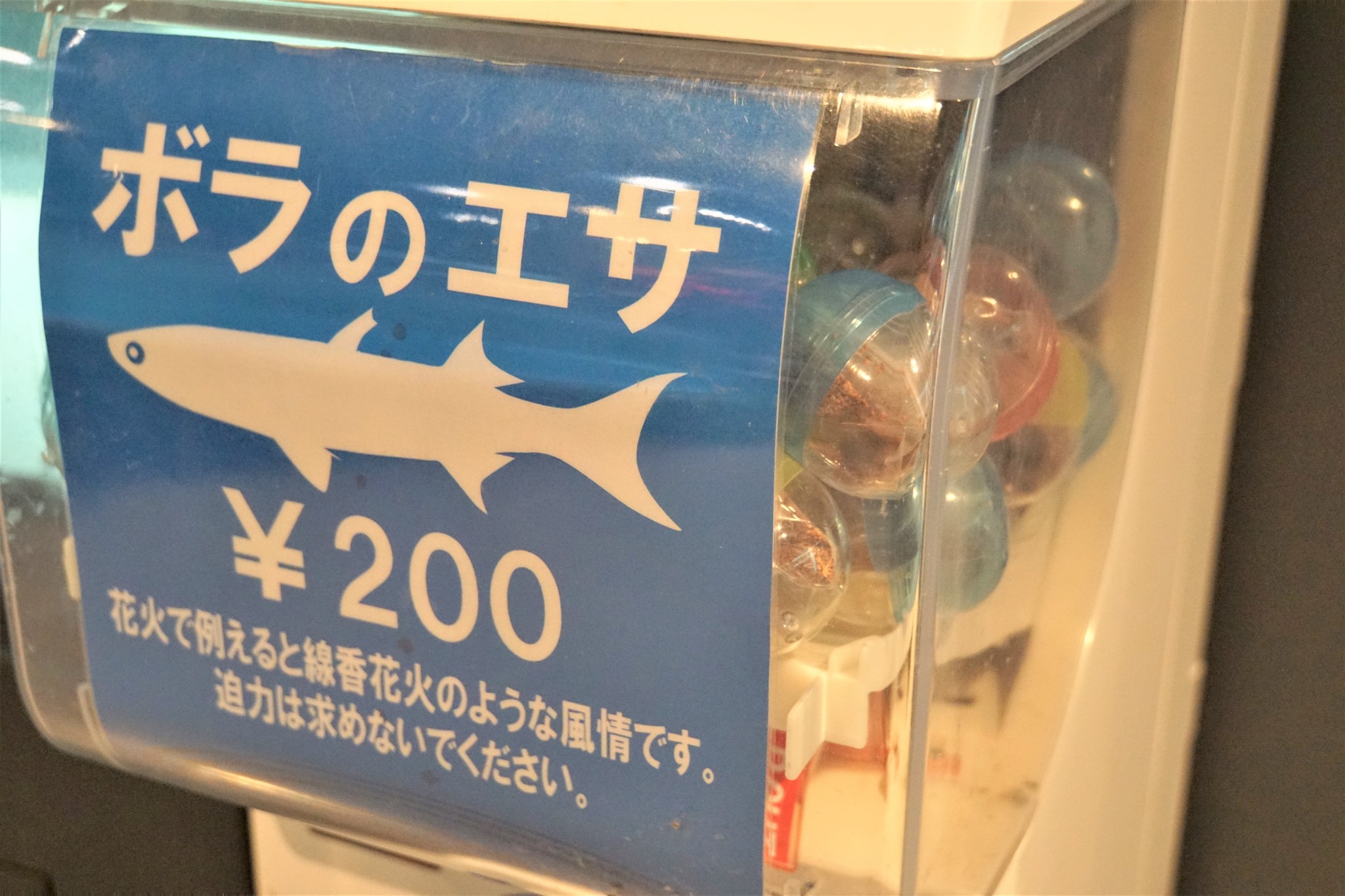 スタッフが港ですくってきたというたくさんのボラには、エサをやれます。ただし、エサが入ったカプセルトイには「迫力は求めないでください」と注意書きが。