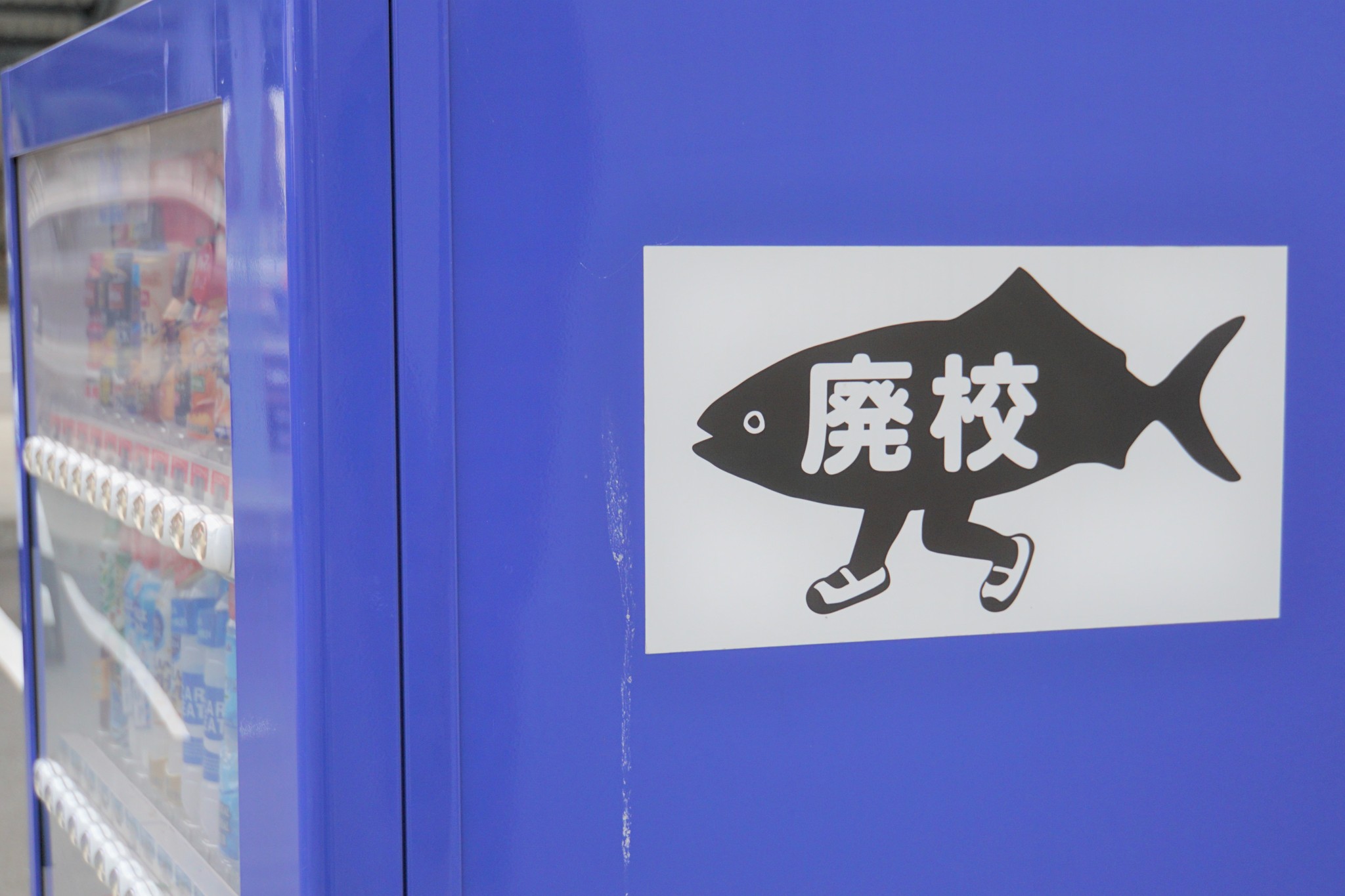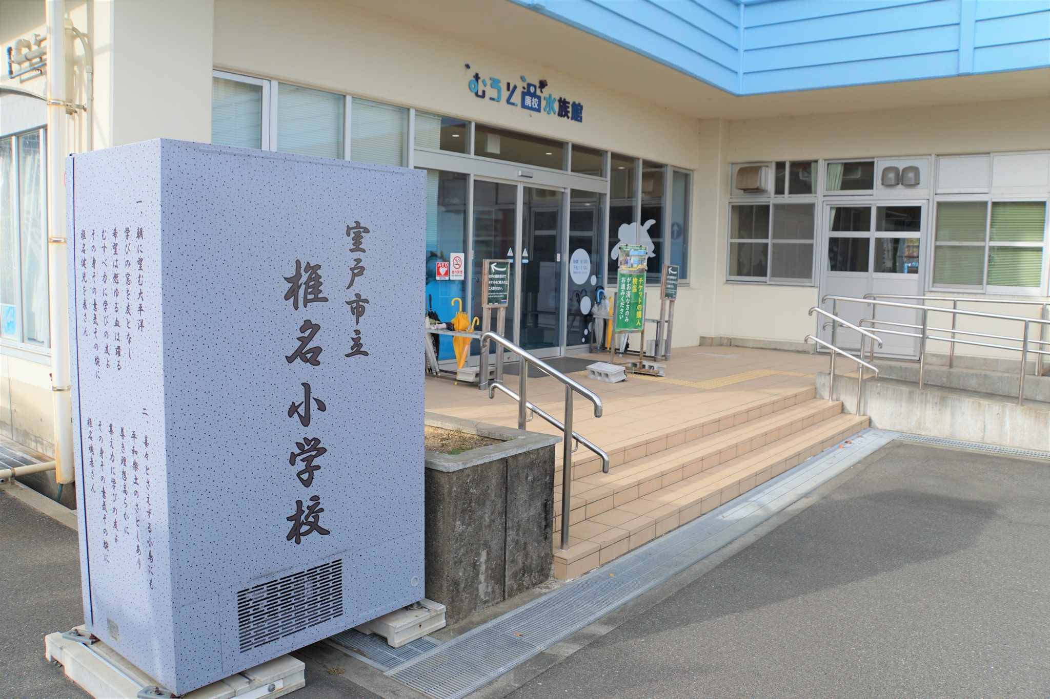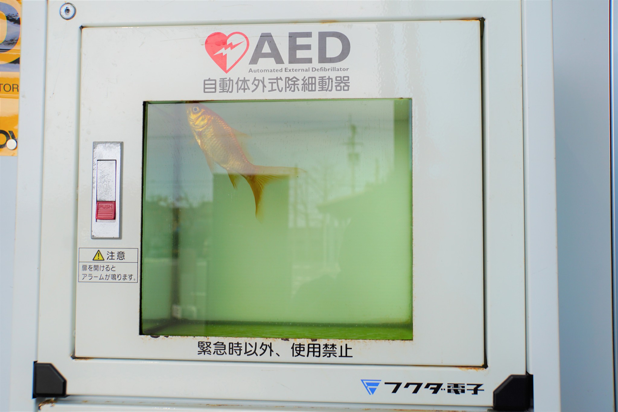 2018年4月にオープンした、むろと廃校水族館。入口には、かつての小学校の面影を残す石碑が建立されている……と思いきや、その正体は自販機。中に入るとすぐ、使われなくなったAEDの箱の中から、金魚がお出迎えしてくれます。