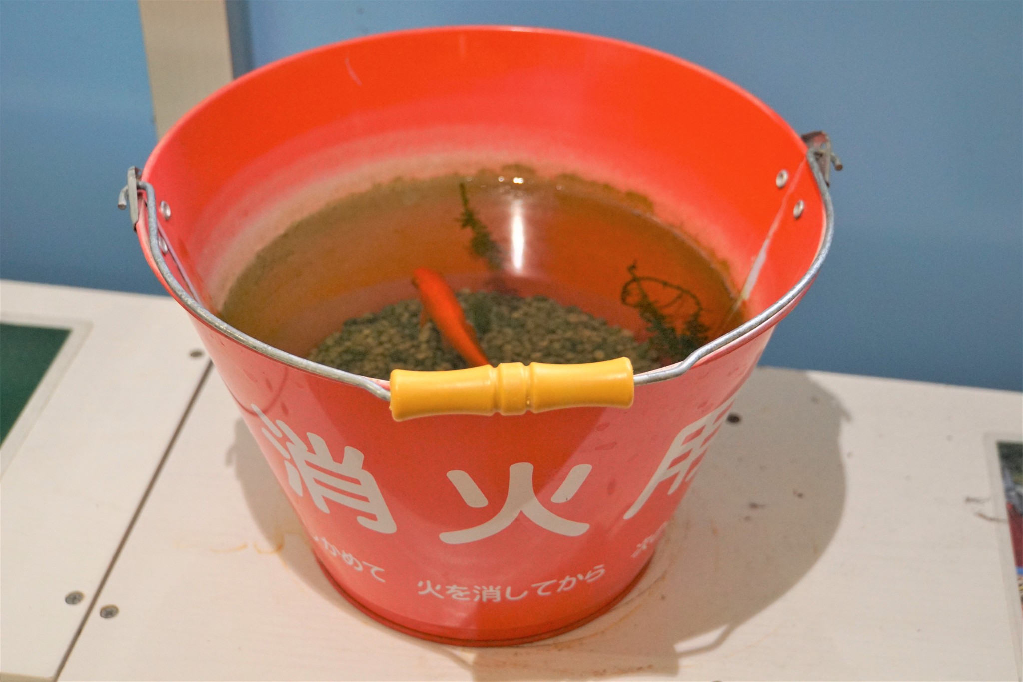 また、シュールなコメント付きの標本、防火水槽にいたという理由で消火バケツに入っている金魚……などなど、最後に25mプールの大水槽にたどり着くまでに、ツッコミどころ満載の小ネタがたくさんあるんです。