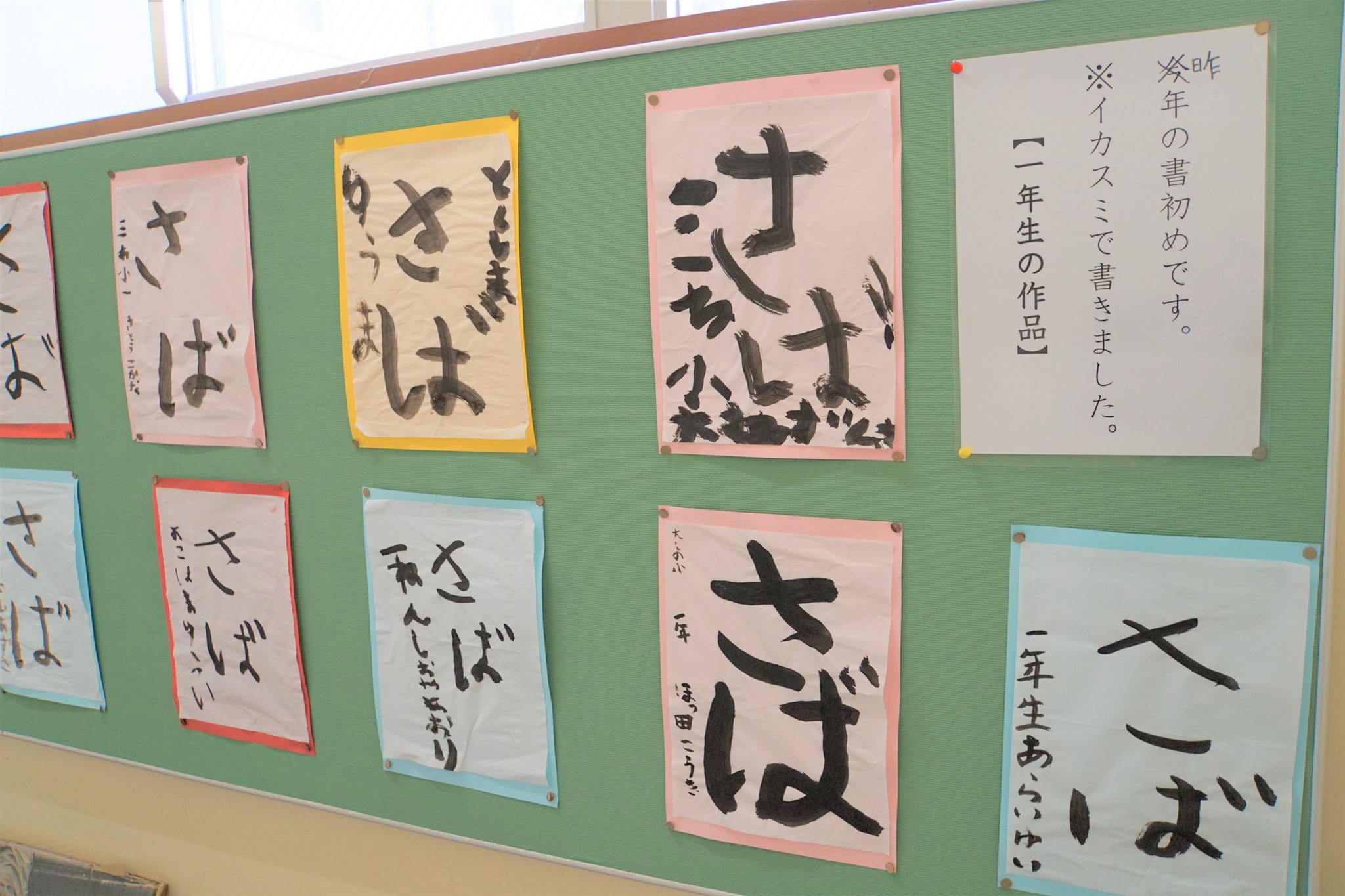 なぜかパンが描かれた水族館の“パン”フレットを手にとり、階段を上ると、踊り場に学校おなじみの書初め(ただし、イカスミで書かれたもの)が並びます。