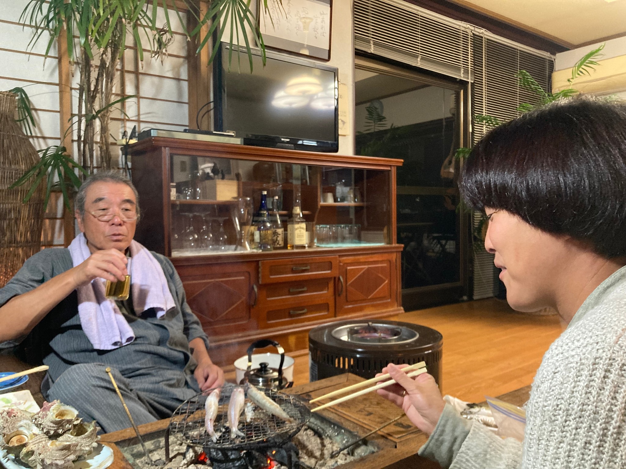 作業をする利用者と談笑する早川さん。長い付き合いだという。