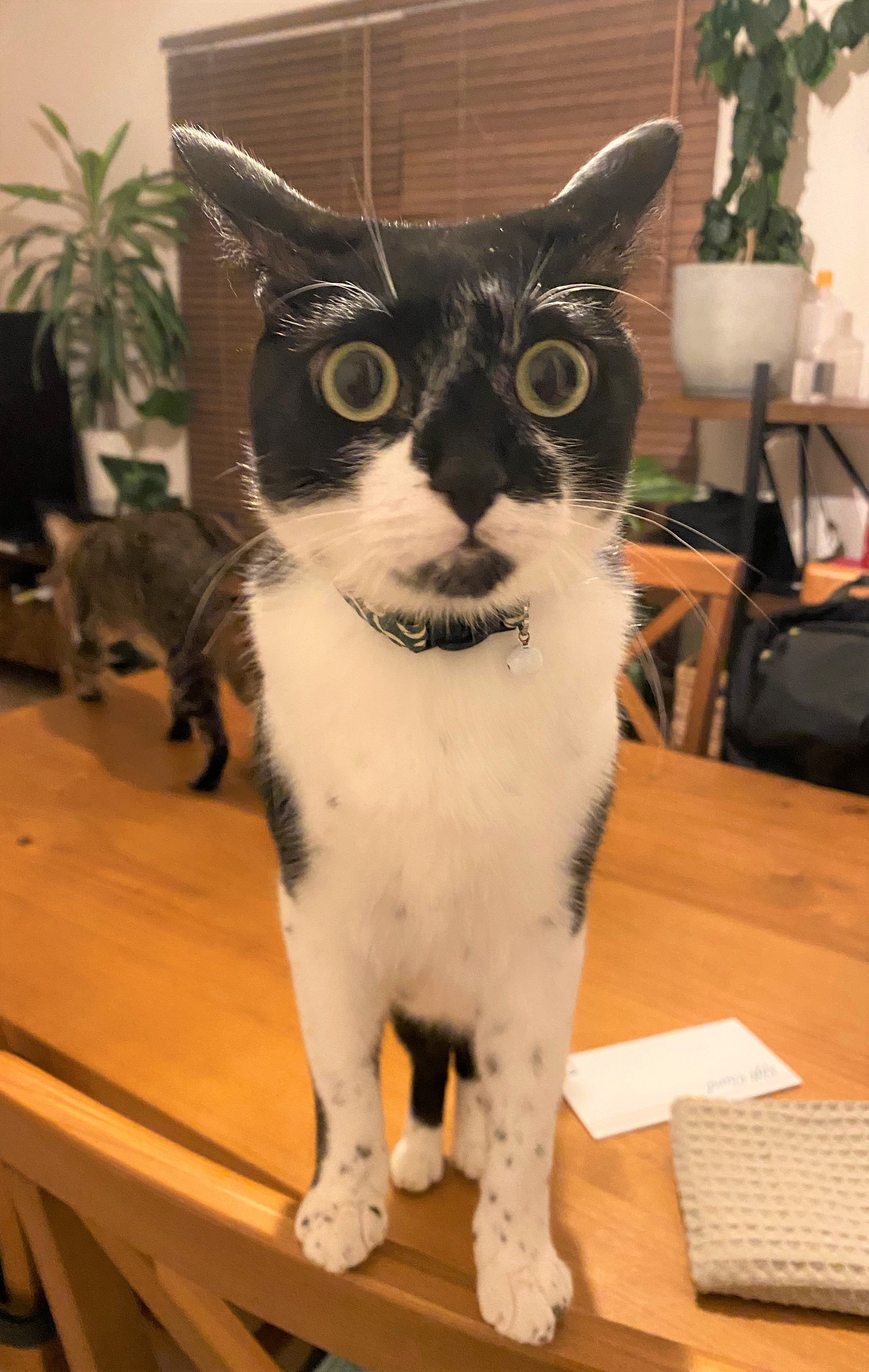 目は口ほどに物を言うという言葉がありますが、まさにその通り、表情を見ただけで、猫の驚きが伝わってきます。飼い主さん(@flare20200523)に話を聞きました。