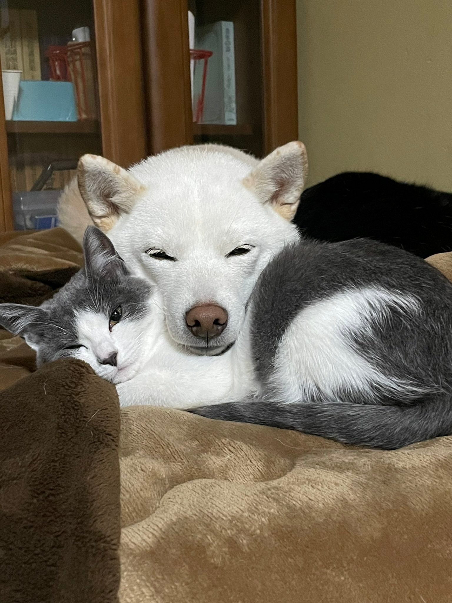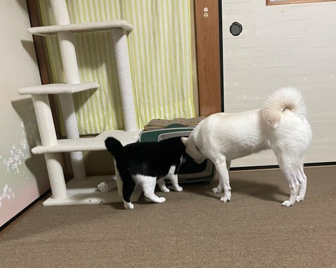 犬が飼いたかった飼い主さん。最初に家に迎えたのは、白柴犬のさくらでした。それから2年ほどたった頃、散歩中に鳴くさくらの目線の先の側溝に生後1か月くらいの子猫を発見。この猫が、百福でした。当時は目やにで目も開いていない状態だったといいます。ところが飼い主さんは、猫アレルギー。百福を連れ帰った時も、目が赤くなったり、かゆくなったりアレルギー症状が出ていたので、里親を探すことになりました。飼い主さんは、里親を探している間、さくらが百福をいじめないか心配したそうですがその心配はありませんでした。