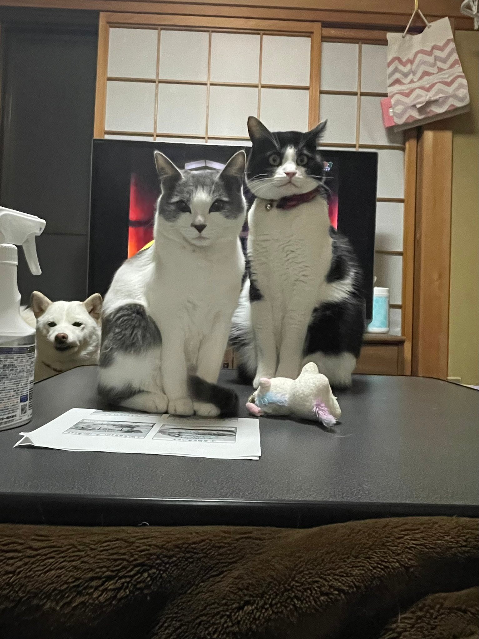 一番下に百福、その上に白柴犬のさくら、一番上に写っている子猫の柚(ゆず)は座椅子の上に乗り、今の形が完成しました。