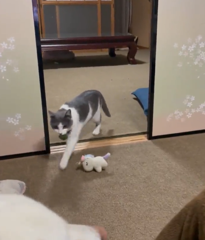 「普通、ボールを投げると猫はチョンチョンと手でつつくのですが、柚は、また投げてとボールをくわえて、自分のところに持ってくるんです」柚はさくらを見ているからか、それが普通だと思っているのではないかと話します。