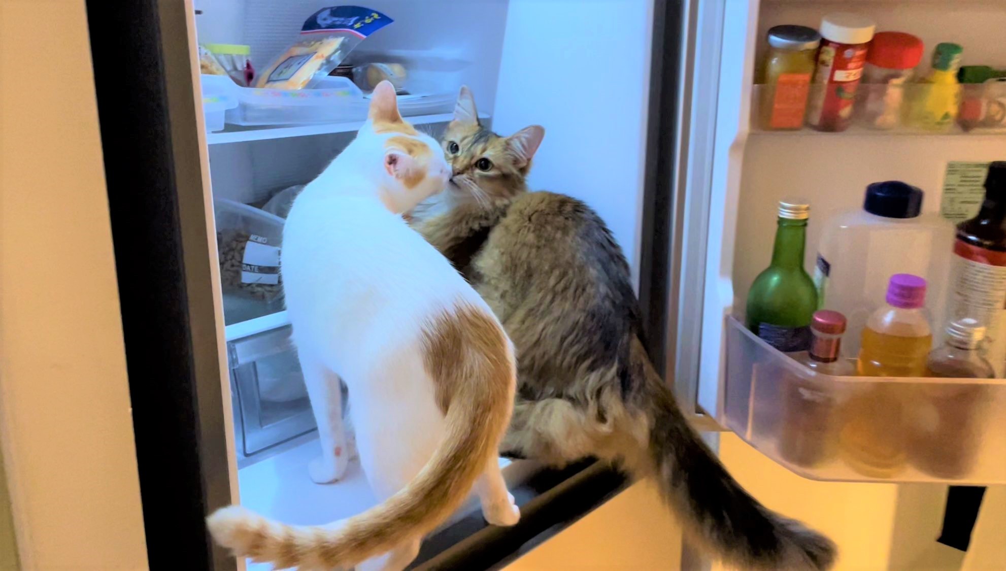 今回は、飼い主さんが風呂あがりに牛乳を飲もうと思い冷蔵庫を開けたら、2匹が床からジャンプして飛んできたそうです。ほっちゃんが先、続けざまに菅田もやってきて、菅田の方からほっちゃんにチューをしました。チューのあとは、2匹とも冷蔵庫の中を物色していたそうです。