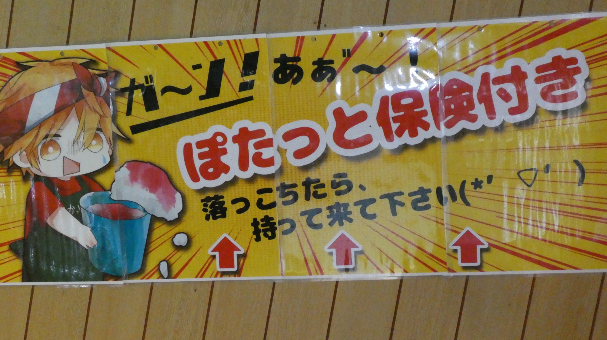 一般的なかき氷に比べると、空洞の上にのせたかき氷はどうしても落ちやすいのが悩みだという。そこを逆手にとり、なんともユニークな「ぽたっと保険」を付けてしまうところがおもしろい。かき氷を落としてしまったら、保険でもうひとつのせてもらえるのだ。もちろん、保険は商品代金内。