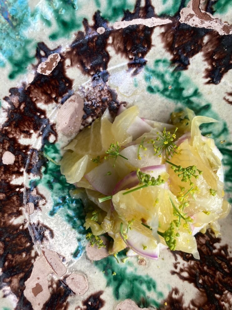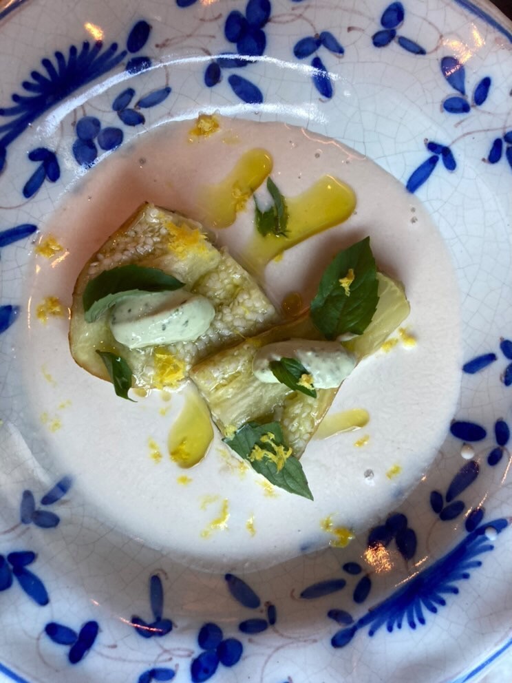 ベビーコーンも緑のソースの上に乗せ、絵になる料理となる