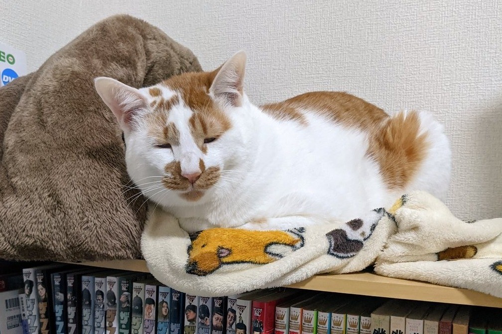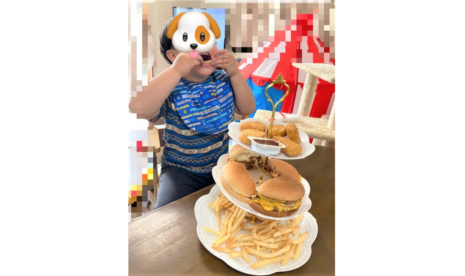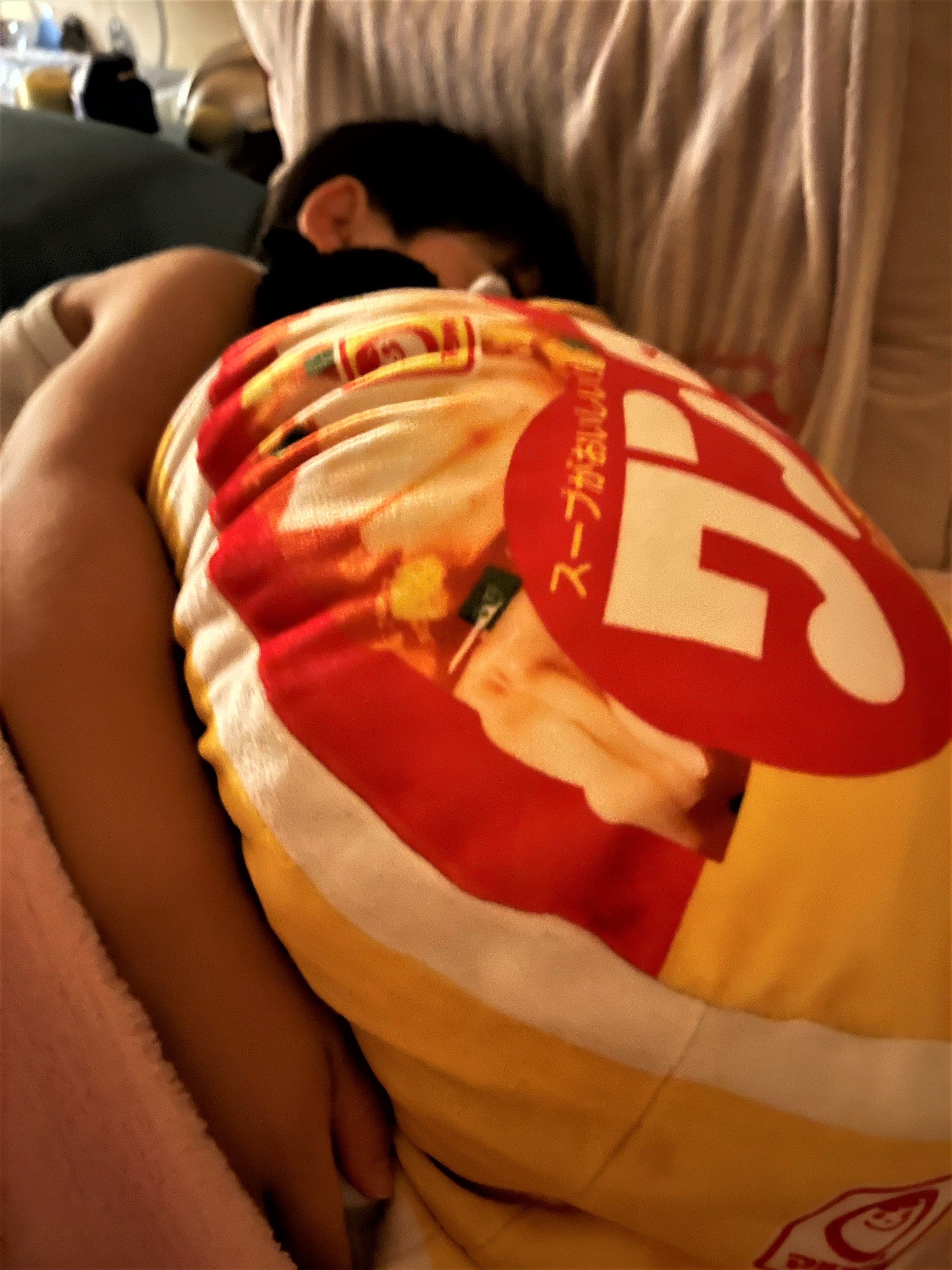 男性からもらった、マルちゃんのワンタンのクッションを抱く息子さん(@mychonanloveさんより提供)