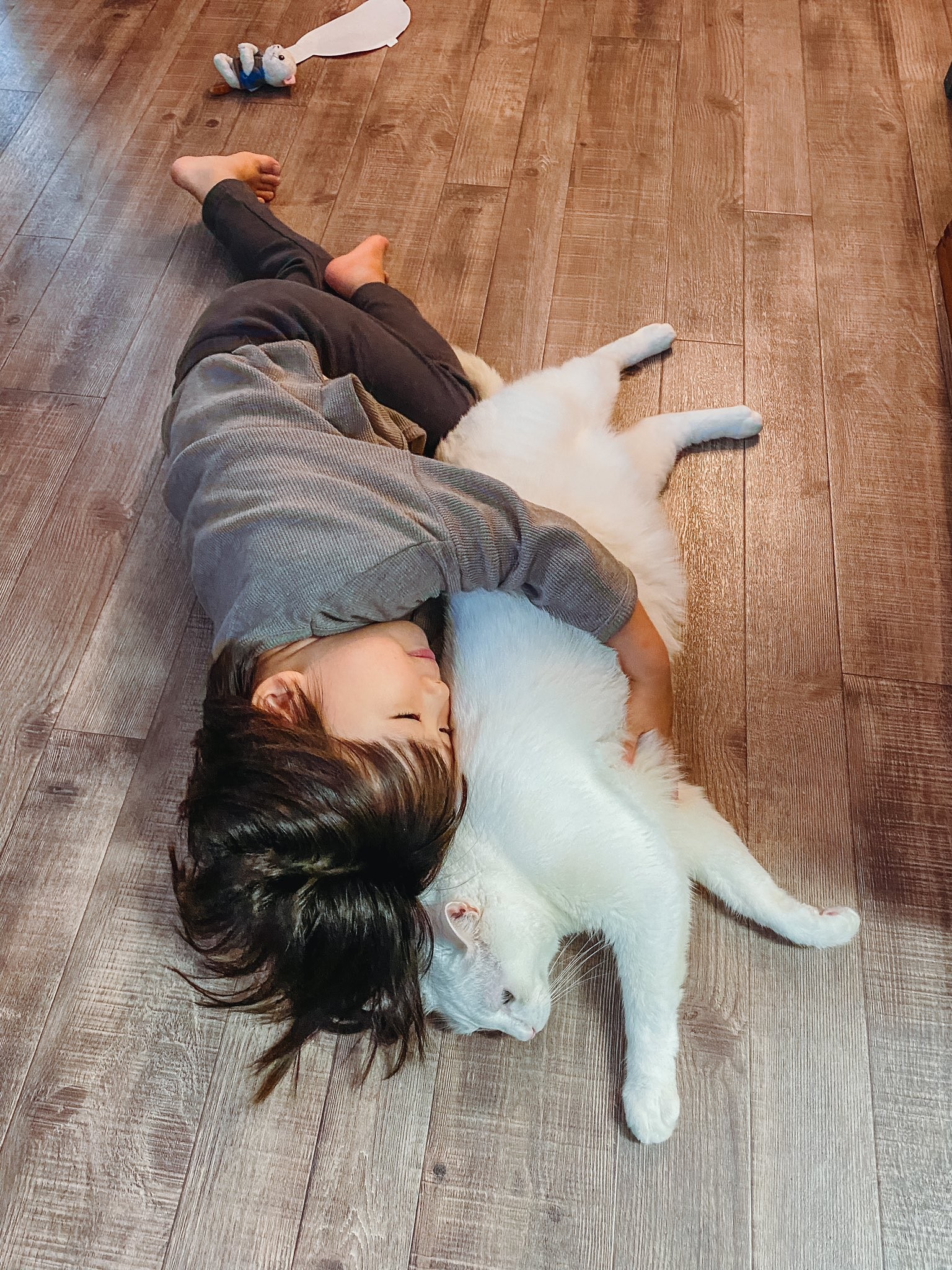 「どいて―!」トイレに行きたい3歳児と寝たい猫の微笑ましい攻防戦