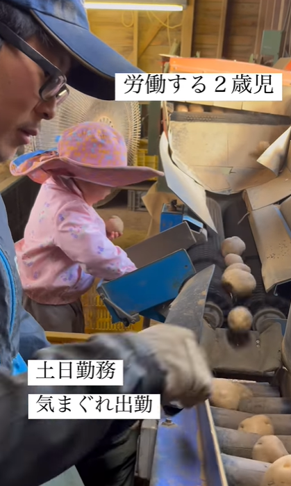 子どもが、「親のしている事を真似したがる」ことよくありますよね。パパの仕事を手伝っている2歳児。コロコロと機械の上を転がってくるじゃがいもをとって「ハイ」と隣の人に渡しています。作業が板についていてとてもスムーズです。この様子がInstagramに投稿され115万回以上再生されるなど話題になっています。この動画を投稿した、いんなみ家さん(nacchantomikudabu)に話を聞きました。