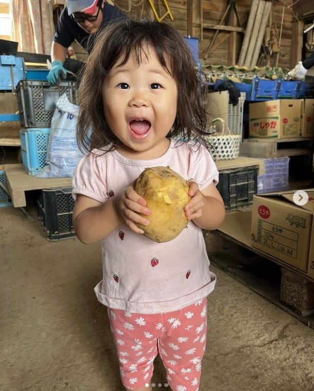いんなみ家さんは、じゃがいもを渡している2歳の女の子なっちゃんとその妹2人の子どもを育てています。じゃがいもだけではなく、他にも大根、人参、長芋、小豆、さつまいもなどを栽培し、黒毛和牛などの畜産業を営んでいます。