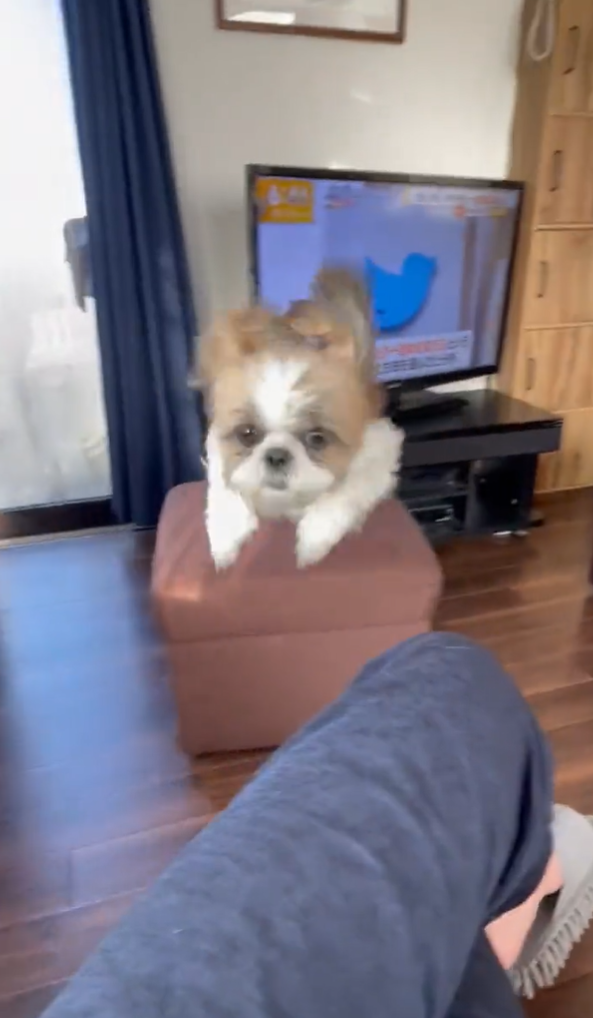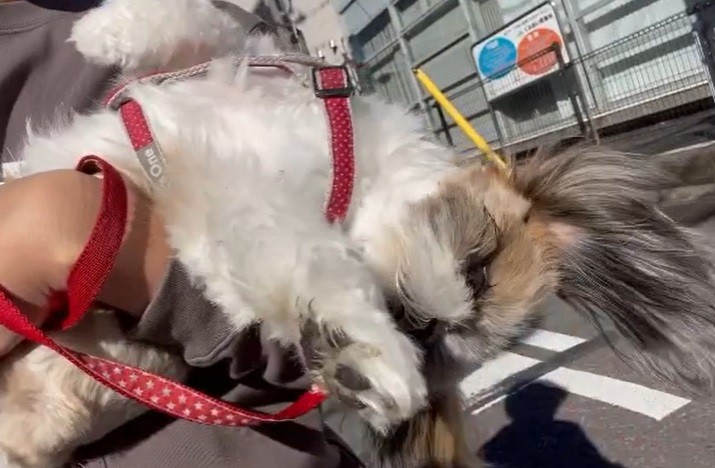 飼い主の、空飛ぶシーズー奈々(@GUBvstjOToFaNsF)さんによると、ななちゃんは毎日の散歩で、用を足すまではきちんと自分で歩くものの、終わった後は毎回この「脱力抱っこ」で家まで帰るのだそうです。