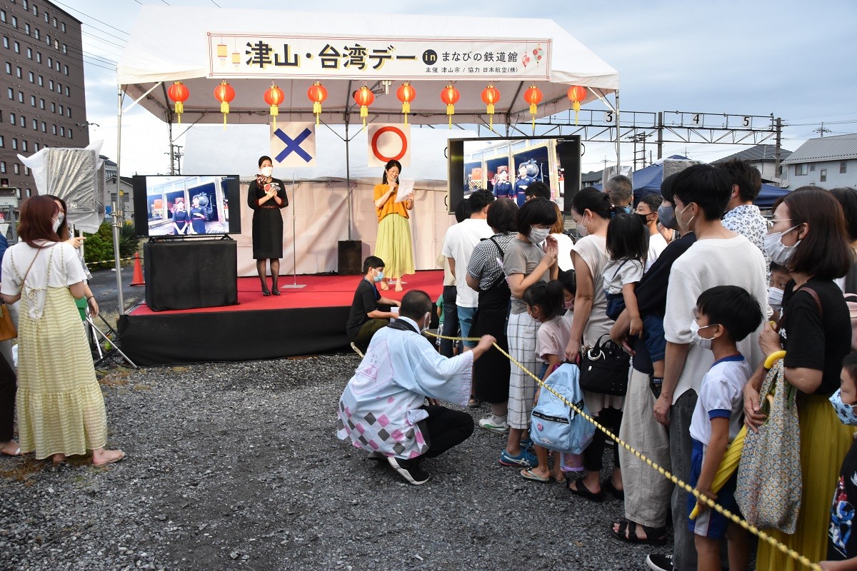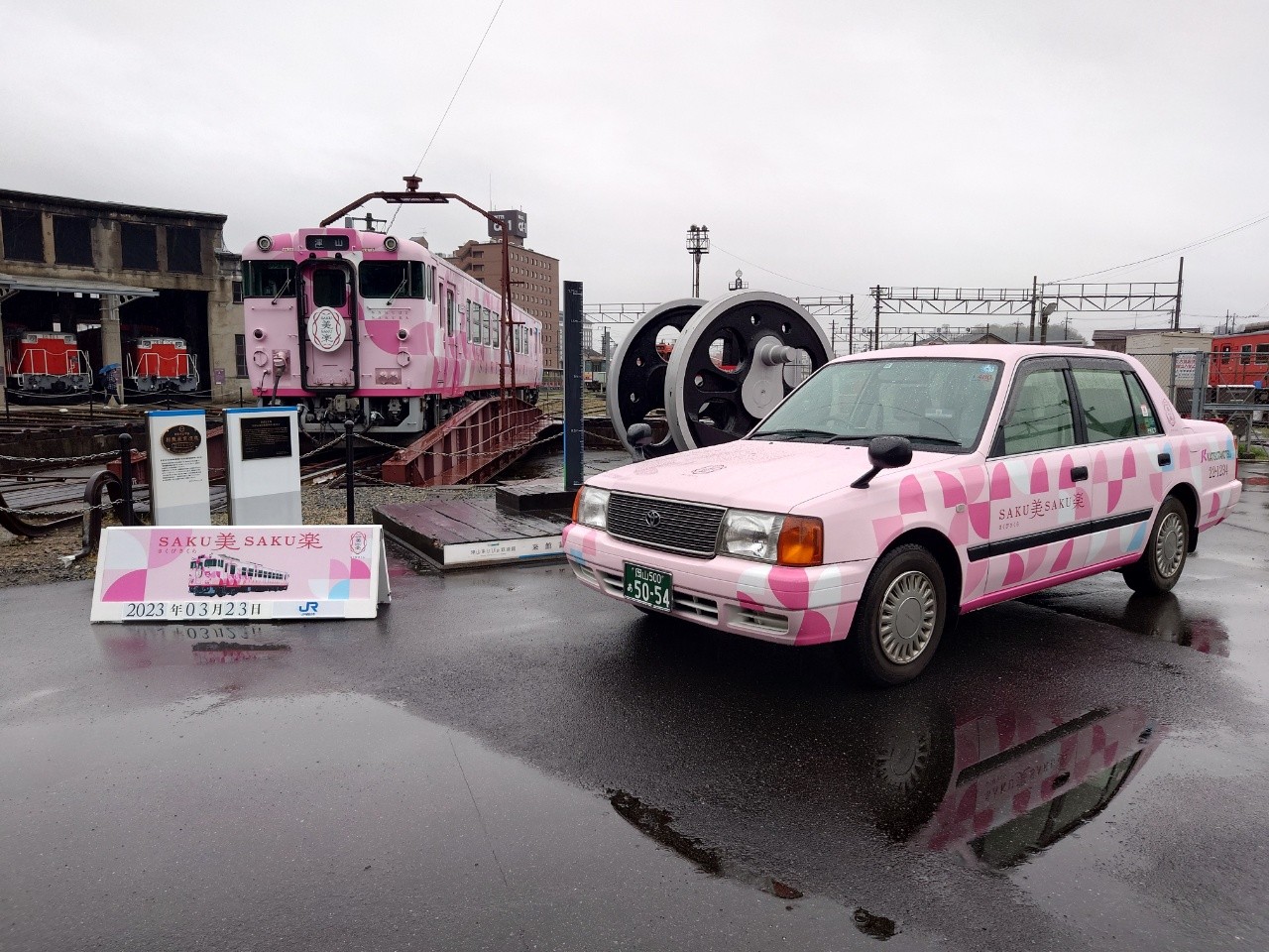 津山駅に到着するJR山陰線観光列車「あめつち」。2018年の運行開始以来、初めてJR因美線を走行した(2022年7月)。