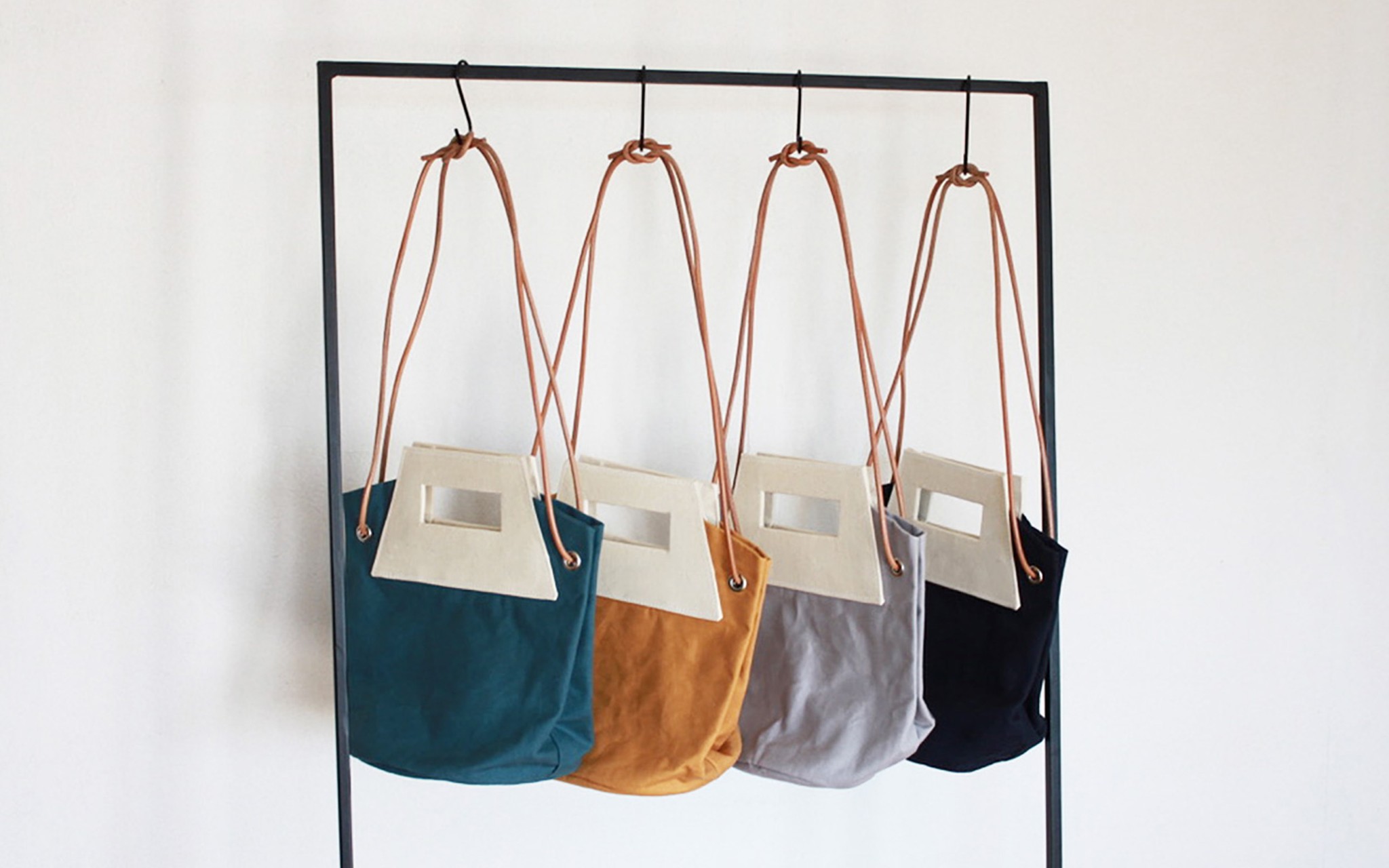 2021年4月に高松市の古民家「旧南原邸」で開かれた展示会。山型のポーチが並ぶ(提供)