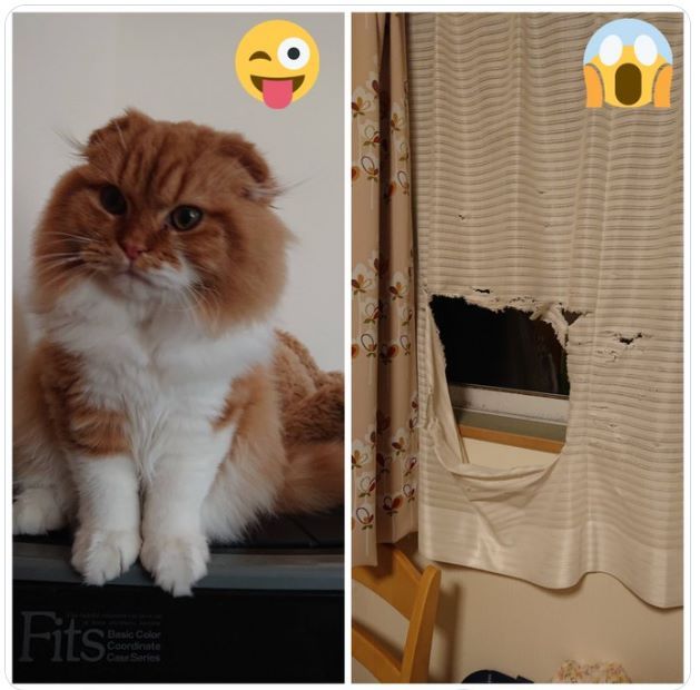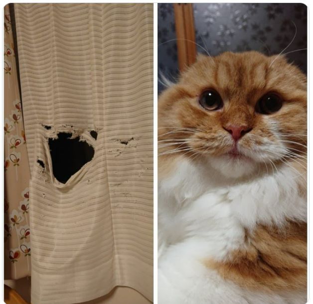 破れたカーテンの奥で堂々とカメラを見つめる猫ちゃん。こちらはスコティッシュフォールドのだのんくん。Twitter上に画像が投稿されると、「すばらしい作品」「すごい力作作ったのね」「がんばって作ったんですね」とたくさんのコメントが寄せられ、話題になっています。