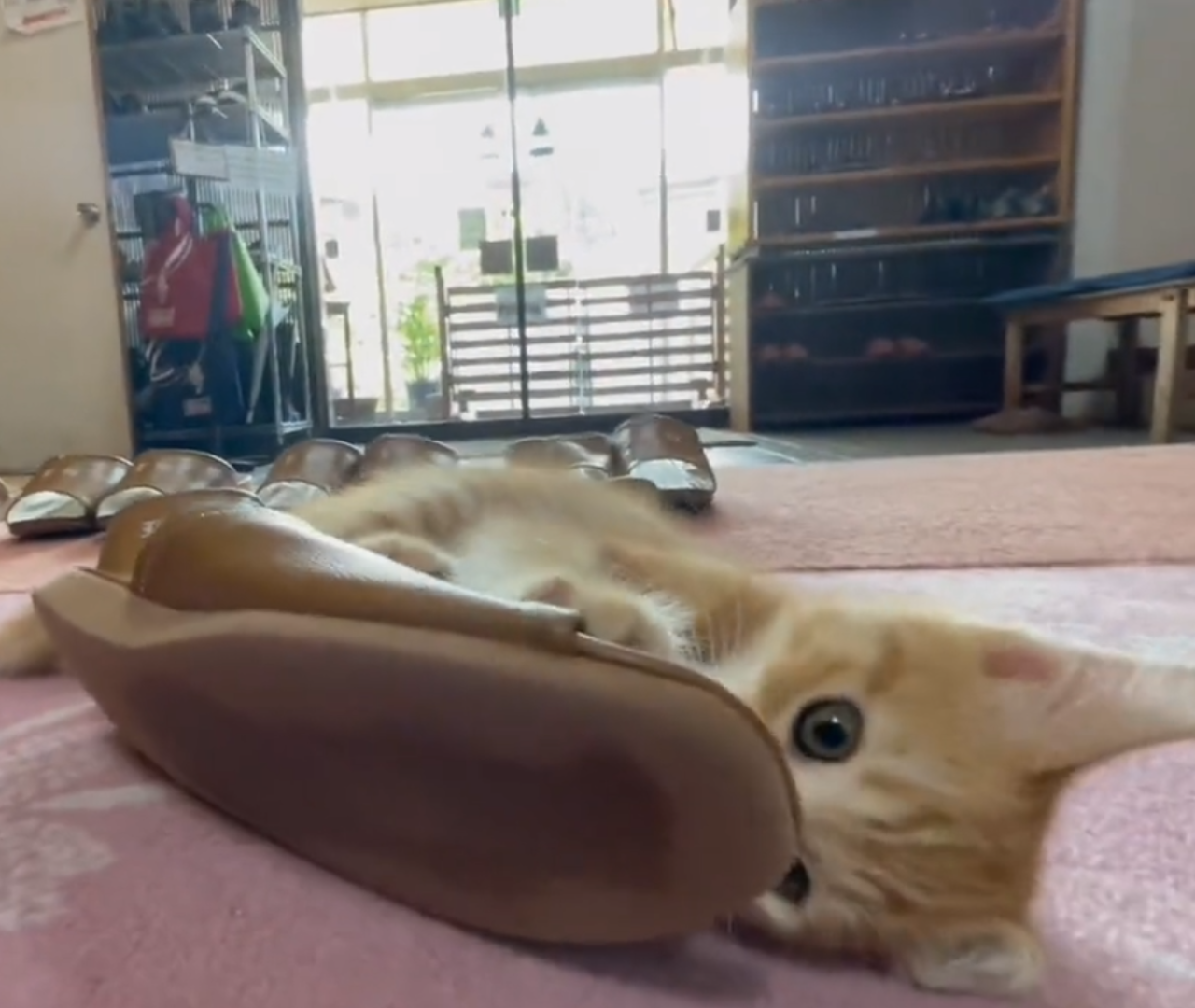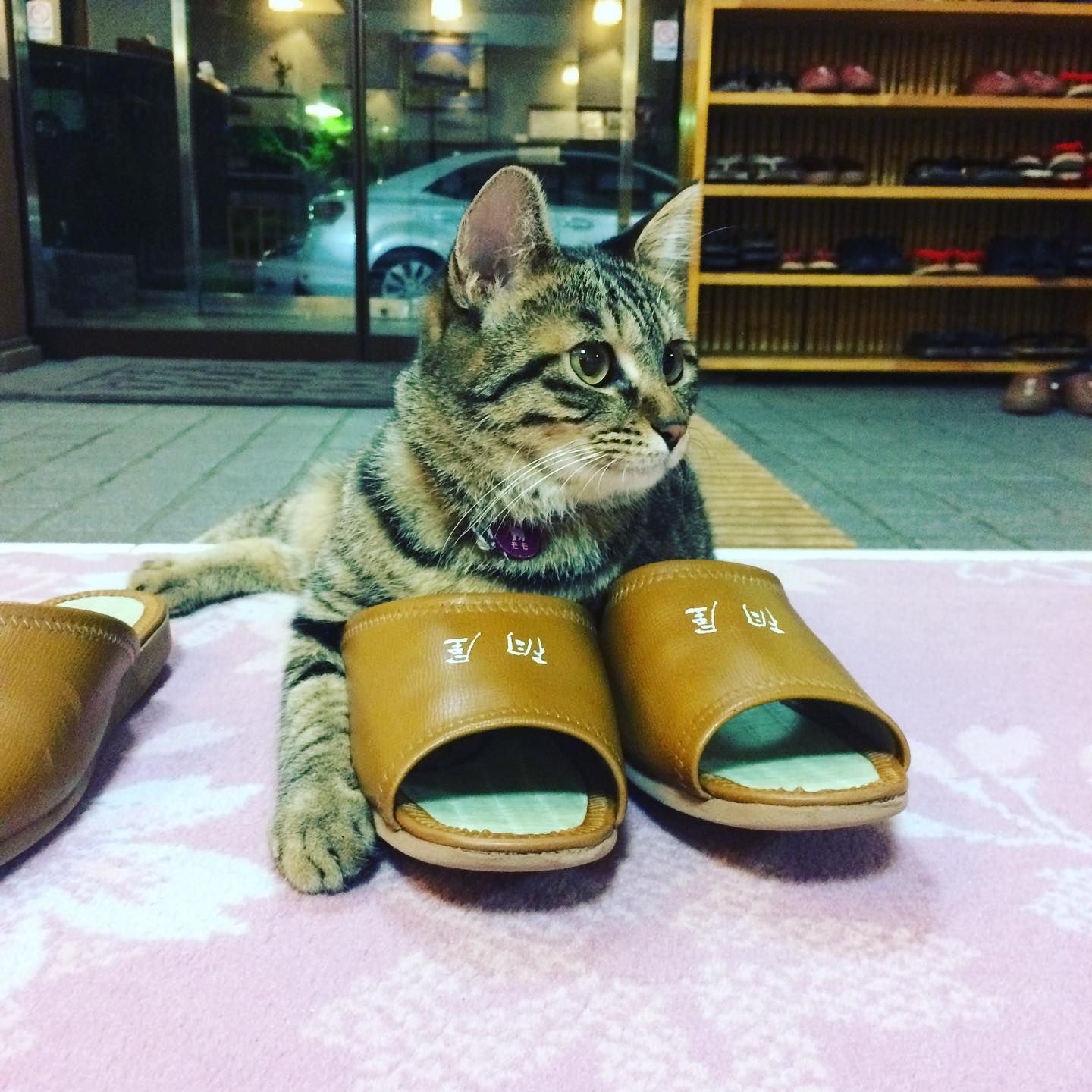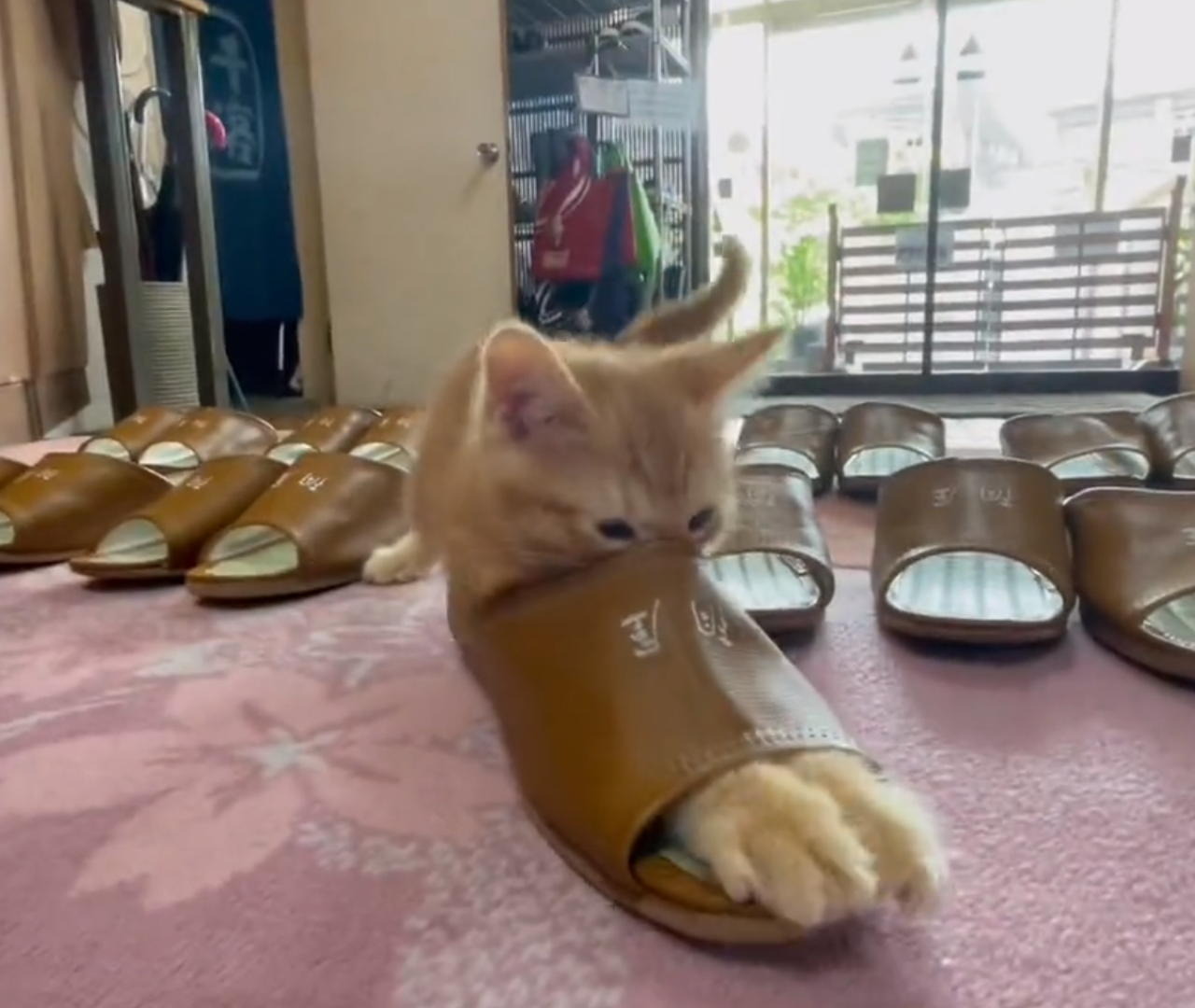 スリッパ温め係研修中のうめ吉くん(@kiriyaryokanさんより提供)