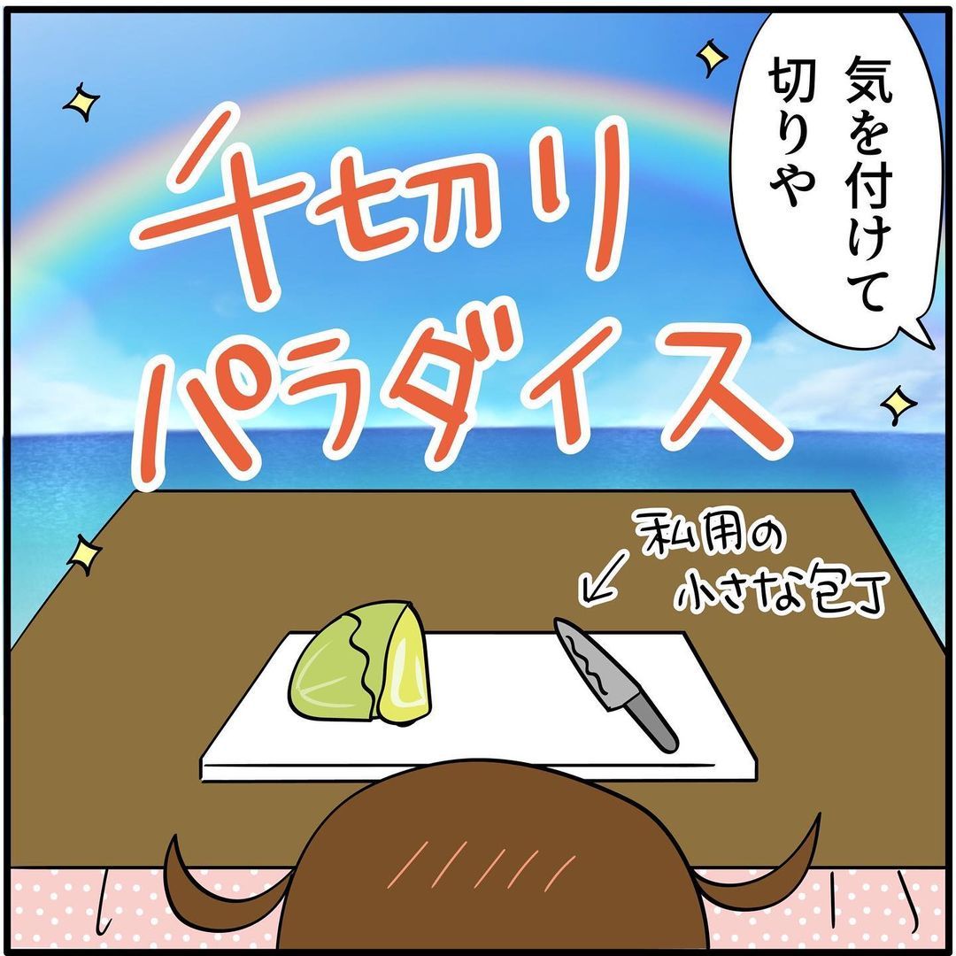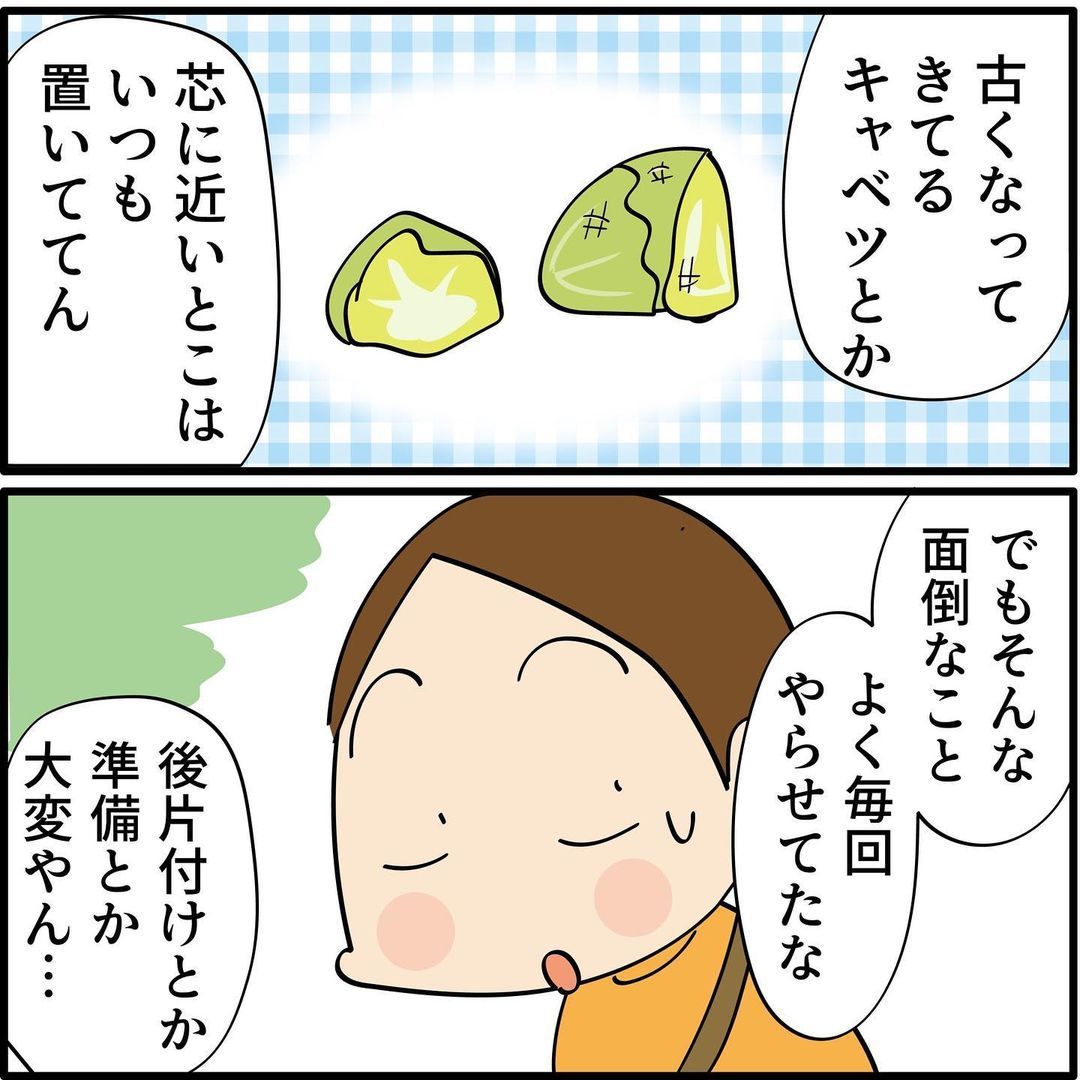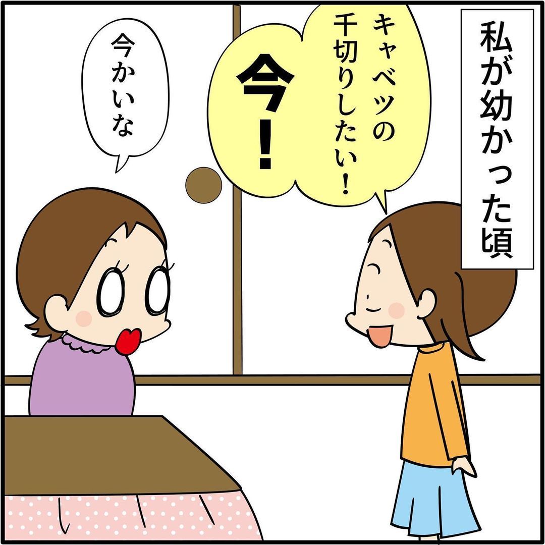 自分が親になった今は「こんな面倒なことよくやらせてくれてたなぁ」と思いました。私がいつ「千切りしたい」と言ってもいいようにキャベツを置いていてくれてたことにも驚きました。
