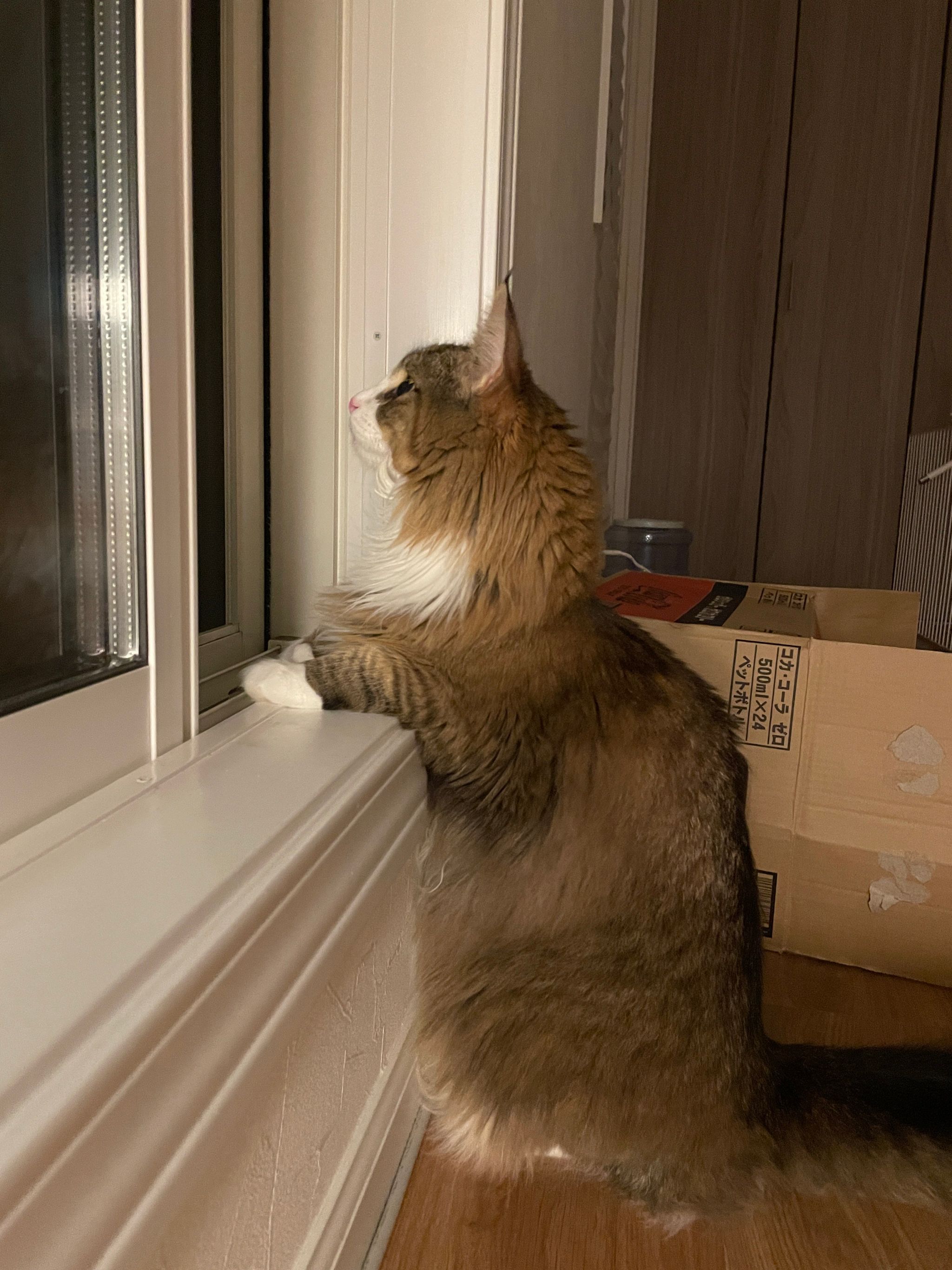 窓の外を眺めているのは、ノルウェージャンフォレストキャットのしろあんちゃんです。しろあんちゃんは、毎晩こうして窓から星を眺めていることが多いようです。