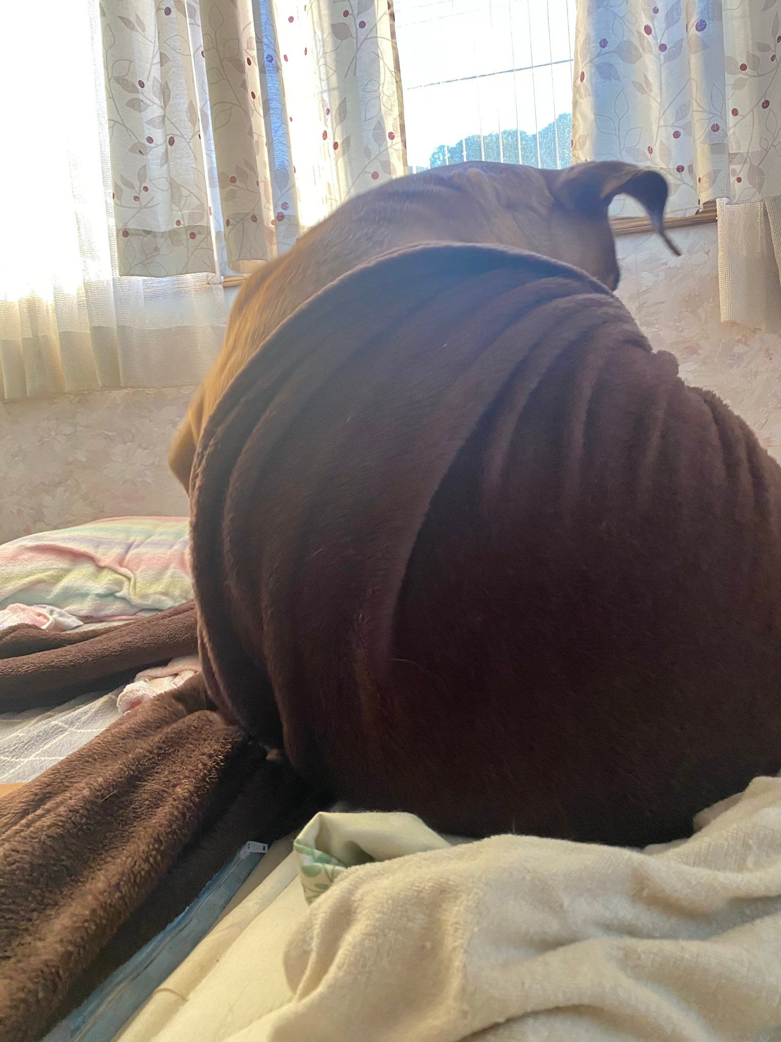 どうやらワンちゃんもそれは同じようで、@6464prprさんのお宅で暮らす土佐犬のアギちゃんは、毛布にくるまって眠るのが好きな様子。しかし、アギちゃんがくるまっている毛布はアギちゃん専用の毛布ではないようです…。
