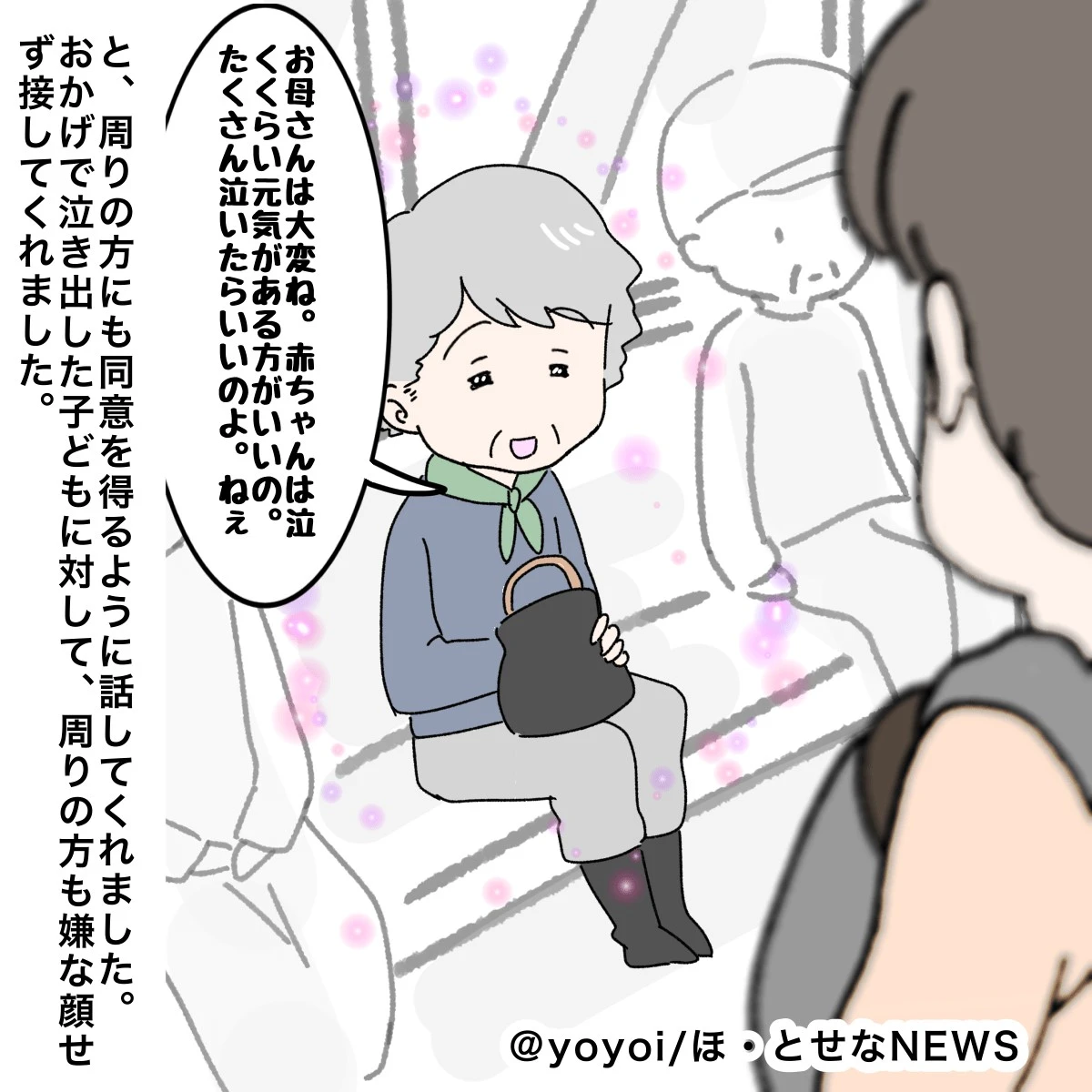 「お母さんは大変ね。赤ちゃんは泣くくらい元気があるほうがいいの。たくさん泣いたらいいのよ。ねぇ」と、周りの方にも同意を得るように話してくれた女性。