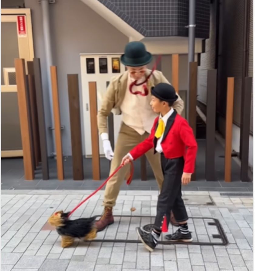 こうやって止まるパフォーマンスを「スタチューパフォーマンス」と呼びます。“歩いている姿”をスタチューにするパフォーマーはたくさんいらっしゃいます。僕はそれに犬を付け加えました。