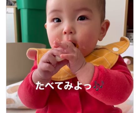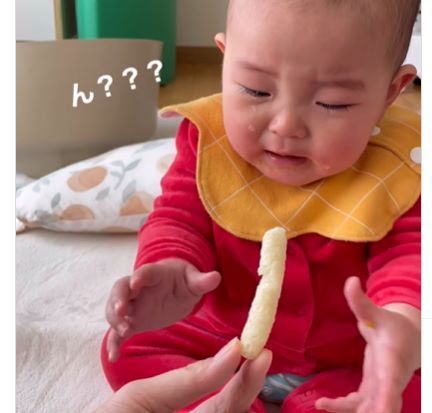 はじめてお菓子を食べる娘ちゃんを見たrinaさんは「かわいい!でも、離乳食の進みが遅くなかなか食べてくれないのにお菓子はたべるんだなぁ」と思ったとのこと。