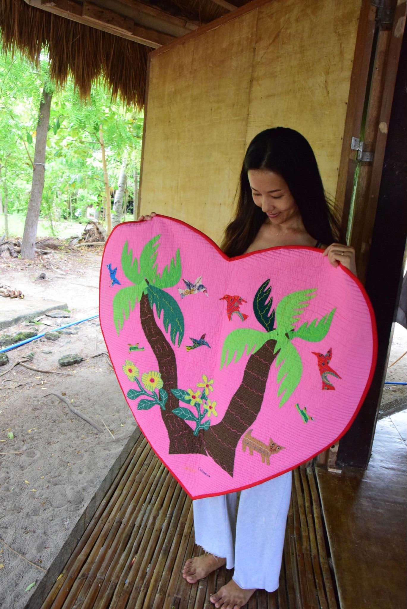 雑貨店では、世界中から取り寄せた手作りの商品を販売していた。カオハガン島で作られるキルト作品と出会ったのはこの頃だ。「カオハガンキルト」の特徴は、島の自然がカラフルなパッチワークで描かれていること。嘉恵さんは作品に関わった人がどんな人なのか、どんな思いで作ったのか想像を巡らせた。