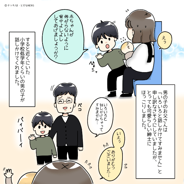 すると、近くにいた小学校低学年くらいの男の子が、電車のガタンゴトンという音がうるさくてリホちゃんが嫌がって泣いているのだと思ったようで、カホさんに「赤ちゃんの耳塞いであげましょうか?」と言って両手で娘さんの両耳を塞いでくれたのです。さらに電車の揺れがちょっと激しくなった際に「赤ちゃんが怖がらないように背中よしよししてあげましょうか?」とも声をかけてくれました。